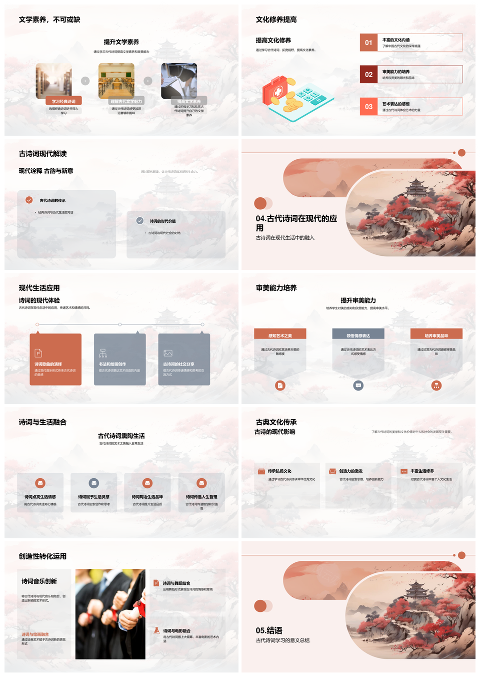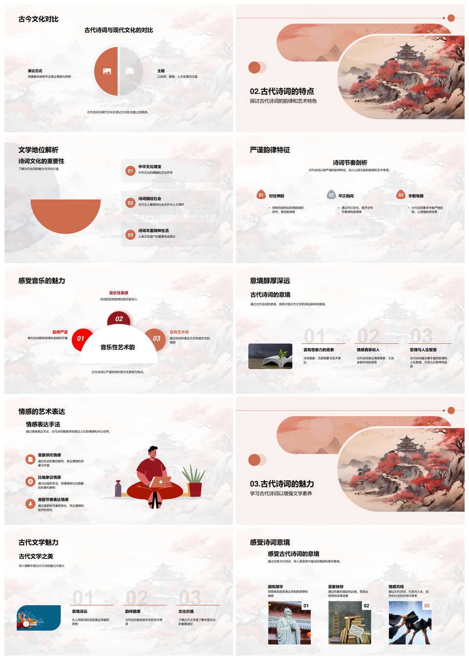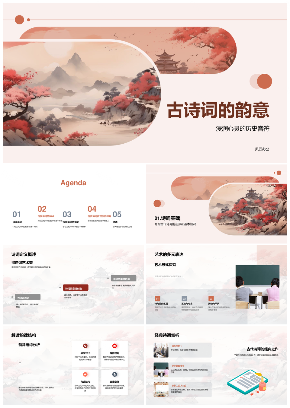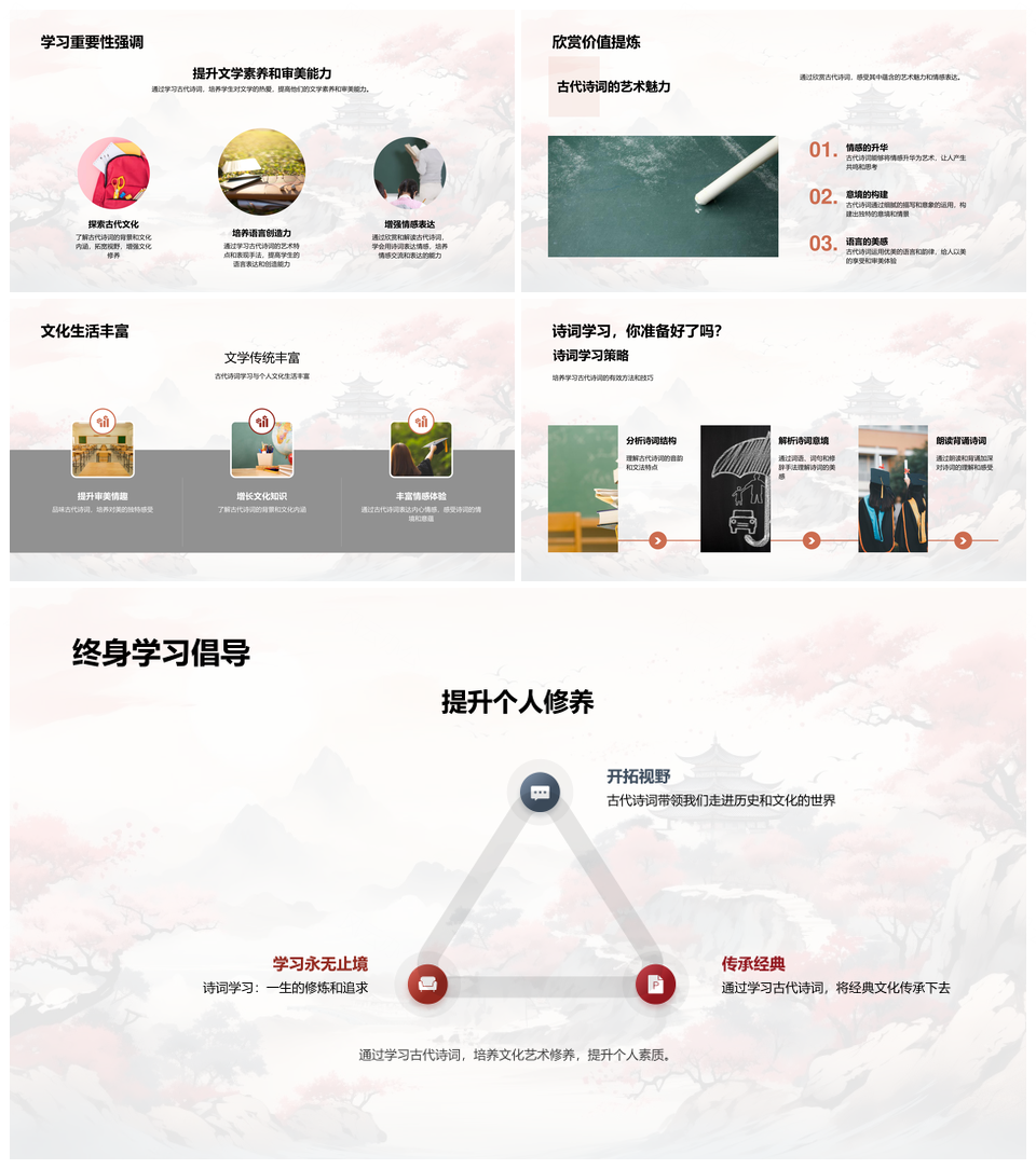 这款模板以经典中国风为基调,融合水墨质感与复古文艺美学,采用正红与酒红作为主色系,传递沉稳典雅的视觉格调。设计运用水墨笔触的虚实渐变,点缀传统纹样与斑驳肌理,既保留宣纸书写的年代韵味,又符合现代简约审美需求。每页版面通过黄金比例划分视觉层级,适配商务提案、文化传承、艺术策展等场景,结构化页面既能清晰展示数据图表,亦可承载书法诗词等传统元素。专业级配色系统经过古典色谱推敲,确保内容在不同设备端呈现协调统一的视觉深度。