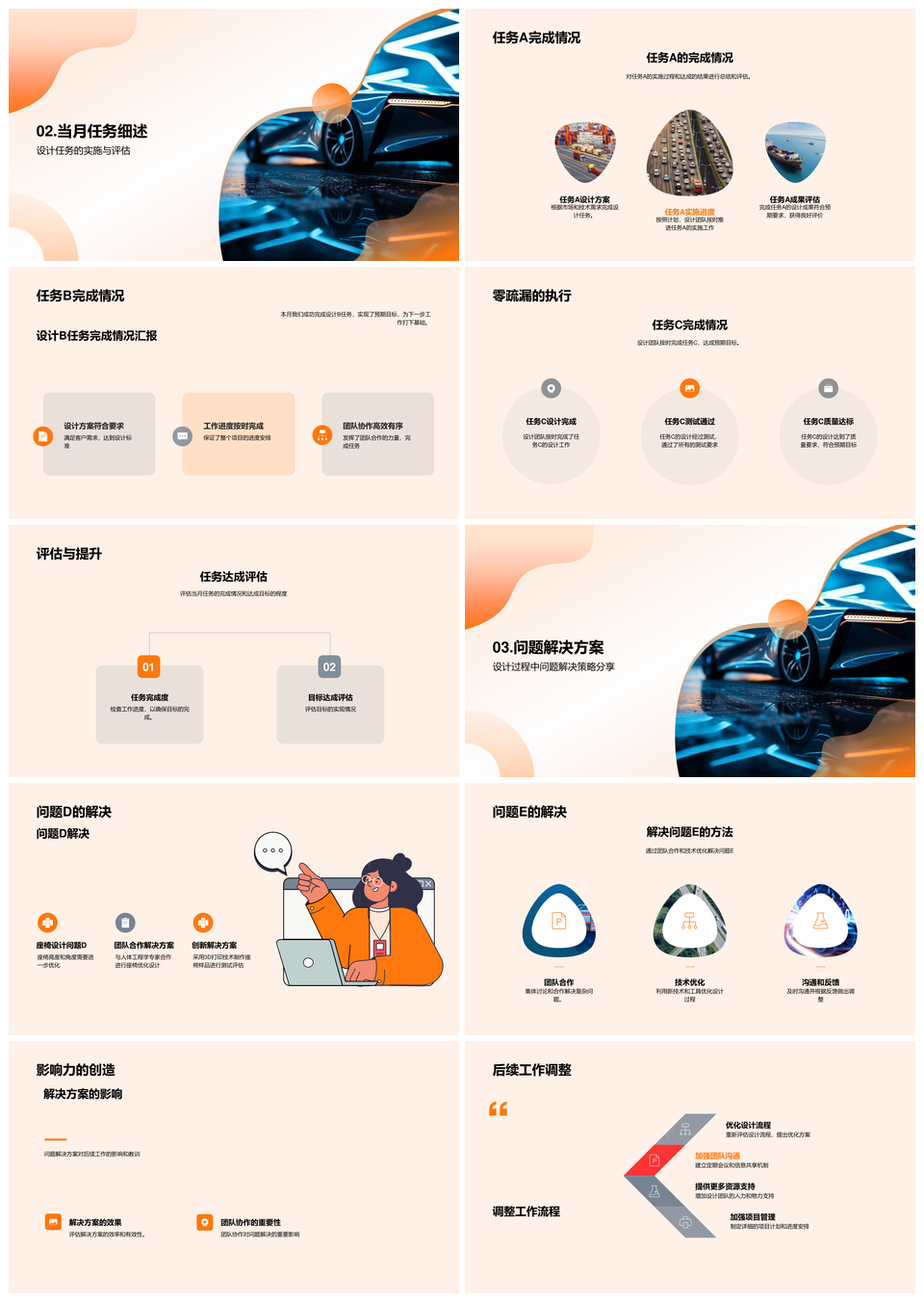 这是一张汽车设计团队月度任务完成与问题解决PPT模板,包含汽车、设计团队、月度任务、完成、问题解决等主题内容,也可用作汽车设计团队月度任务完成问题解决、汽车设计团队月度任务、设计团队月度任务完成、月度任务完成问题解决、汽车设计任务完成、团队月度问题解决、汽车设计团队任务、设计团队任务完成、任务完成问题解决、月度问题解决、汽车设计团队、设计团队月度、月度任务完成、任务完成问题、问题解决等PPT场景使用。