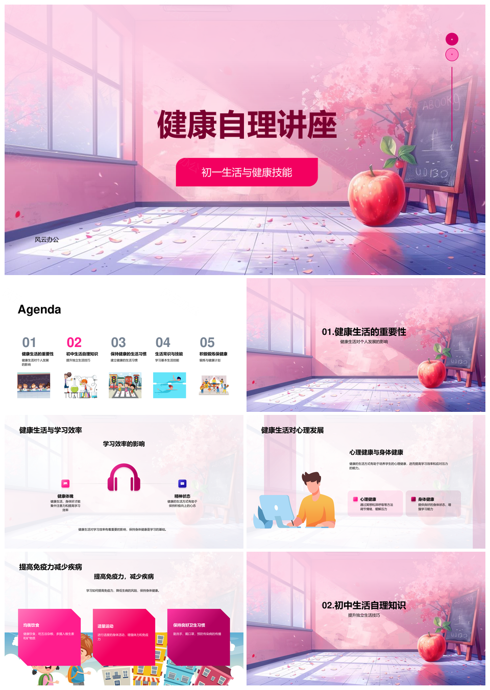 风云办公提供的健康自理提升效率与生活技巧讲座PPT模板,下载格式为pptx,一共23页,作品中文字及图均可以修改和编辑,图片更改请在作品中右键图片并更换,文字修改请直接点击文字进行修改。