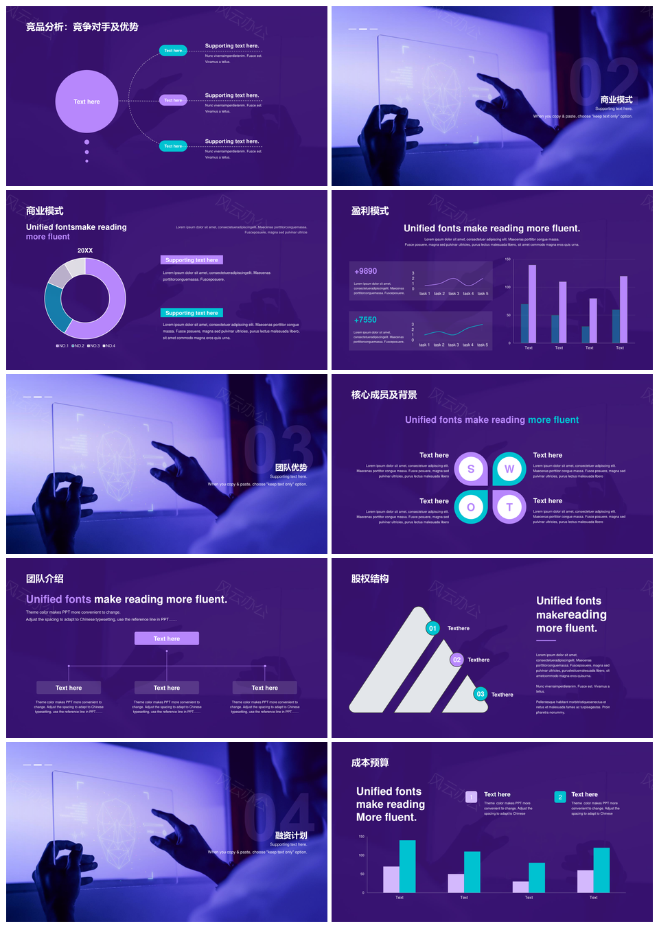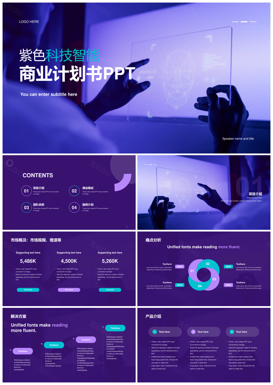 风云办公提供的紫蓝科技互联网商业计划书PPT模板,下载格式为pptx,一共18页,作品中文字及图均可以修改和编辑,图片更改请在作品中右键图片并更换,文字修改请直接点击文字进行修改。