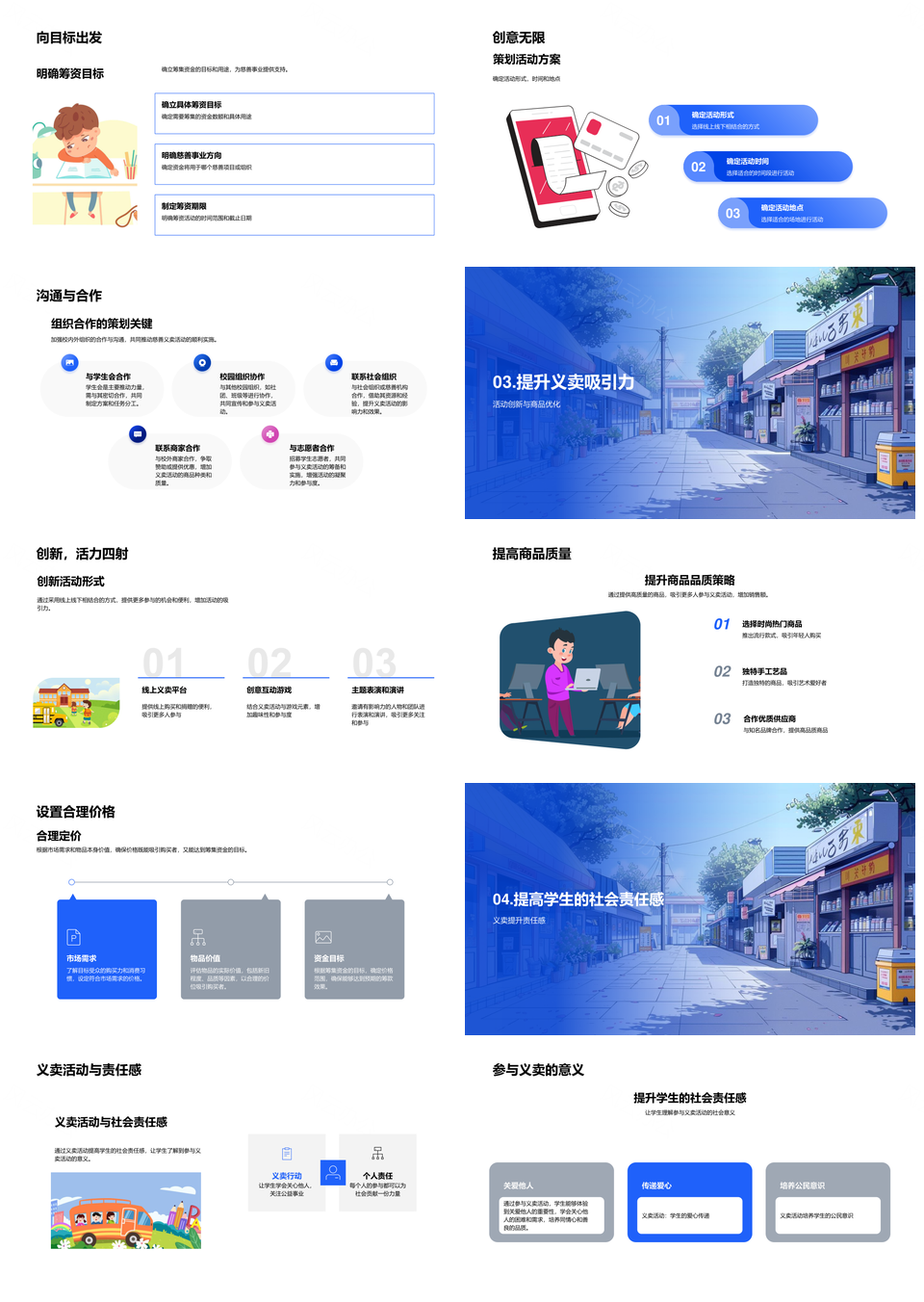 这是一张校园慈善义卖策划教育协作提质筹资活动PPT模板,包含校园、慈善、义卖、策划、教育、协作、提质、筹资、活动等主题内容,也可用作校园慈善义卖策划教育协作提质筹资活动、校园慈善义卖策划教育协作、慈善义卖策划教育协作提质、义卖策划教育协作提质筹资、策划教育协作提质筹资活动、校园慈善义卖策划教育、慈善义卖策划教育协作、义卖策划教育协作提质、策划教育协作提质筹资、教育协作提质筹资活动、校园慈善义卖活动、教育协作提质筹资、慈善义卖策划教育、协作提质筹资活动、策划教育提质筹资等PPT场景使用。 风云办公提供的校园慈善义卖策划教育协作提质筹资活动PPT模板,下载格式为pptx,一共23页,作品中文字及图均可以修改和编辑,图片更改请在作品中右键图片并更换,文字修改请直接点击文字进行修改。
