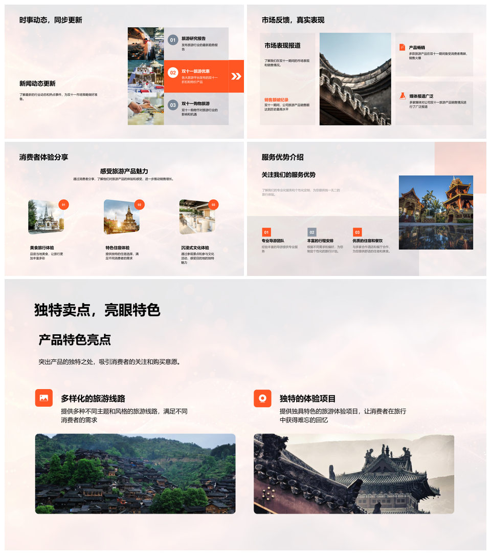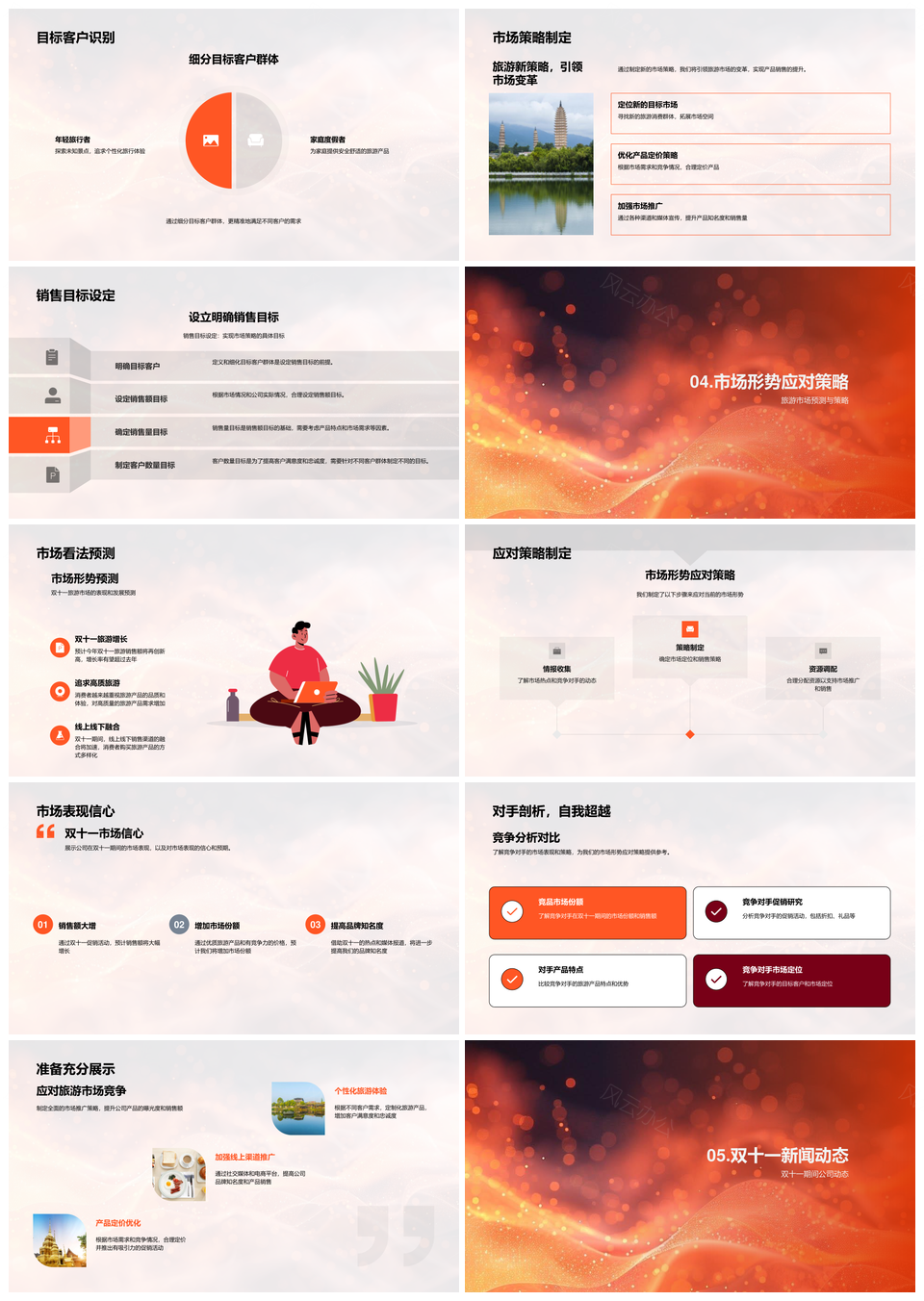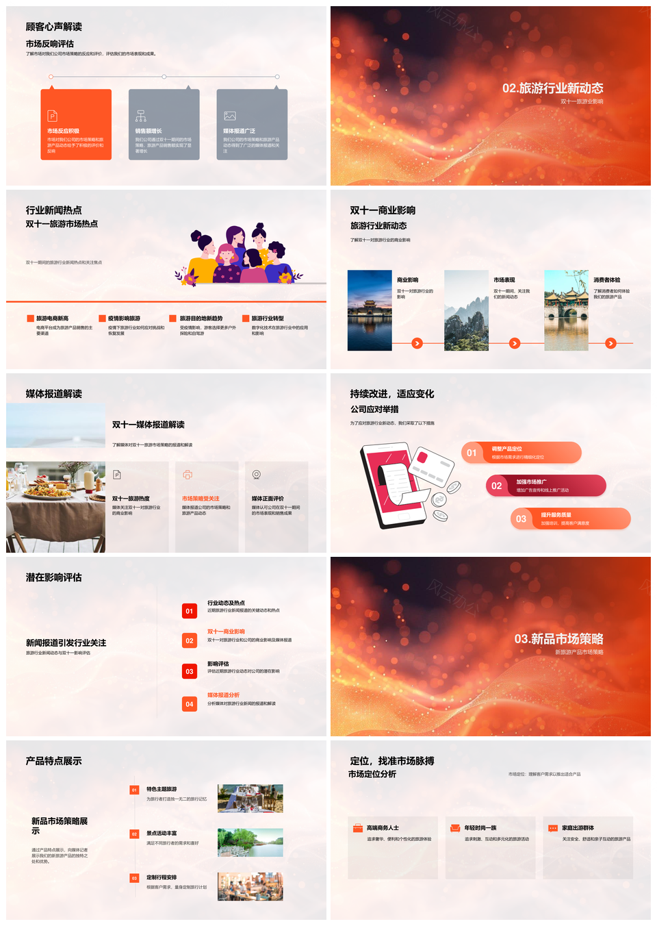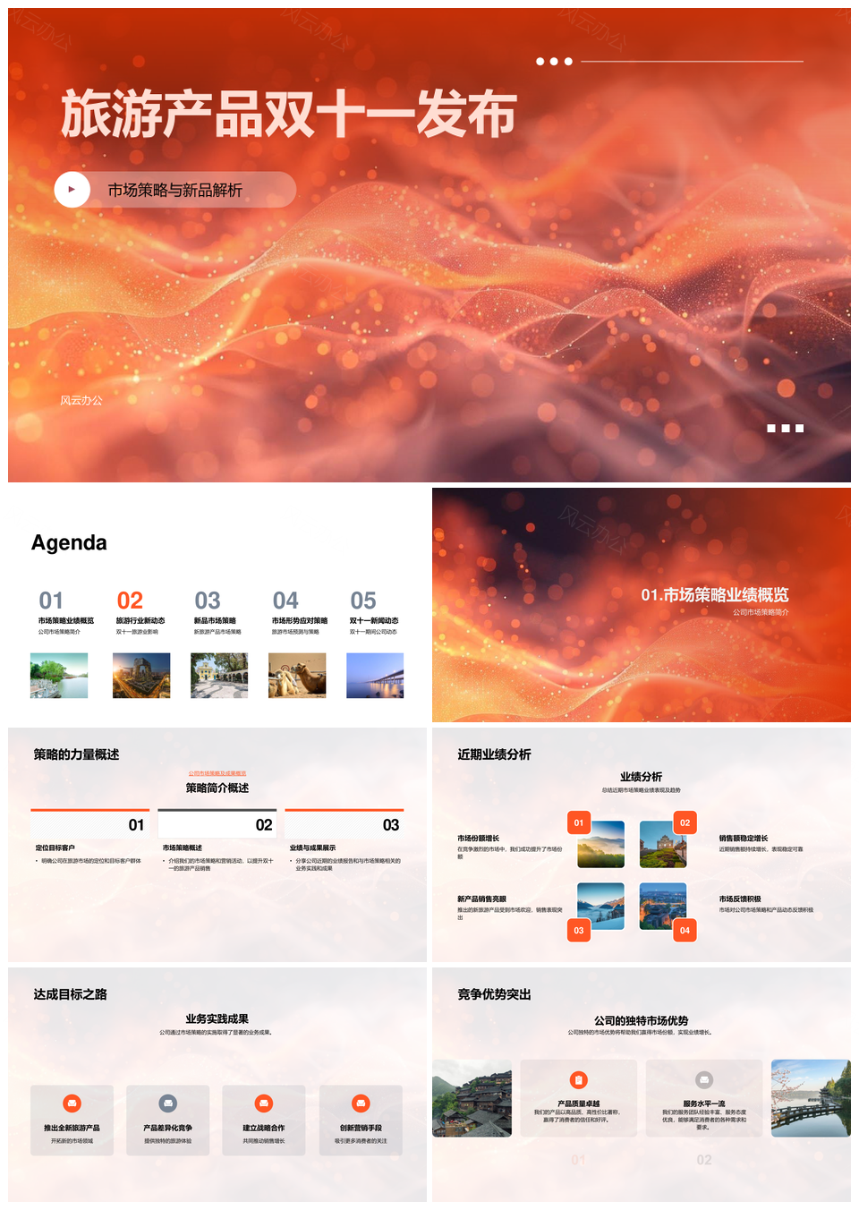 风云办公提供的旅游双十一市场策略新品业绩业务动态PPT模板,下载格式为pptx,一共33页,作品中文字及图均可以修改和编辑,图片更改请在作品中右键图片并更换,文字修改请直接点击文字进行修改。
