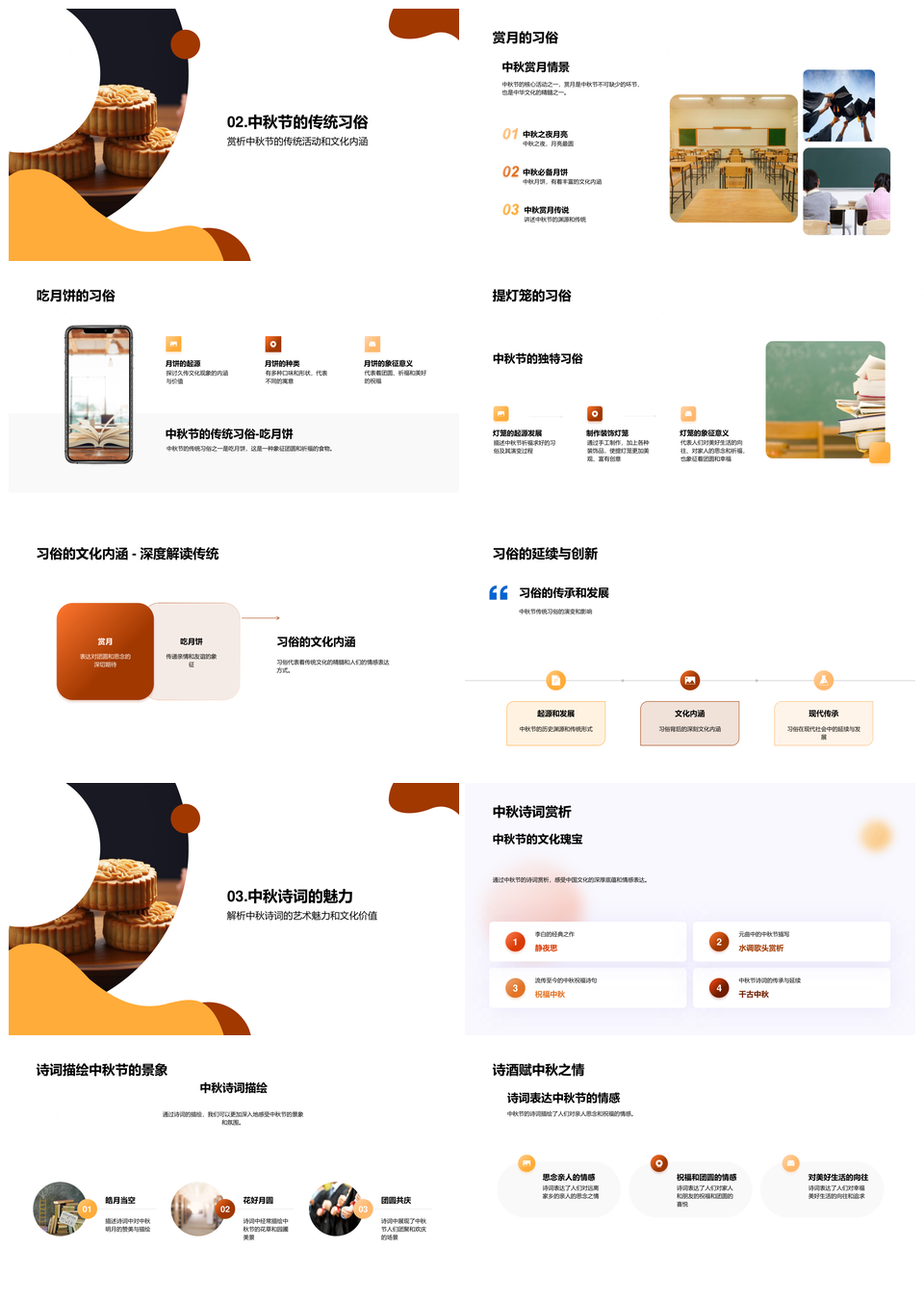 这是一张中秋诗词习俗赏月吃月饼提灯笼传承PPT模板,包含中秋、诗词、习俗、赏月、吃月饼、提灯笼、传承等主题内容,也可用作中秋习俗赏月吃月饼、中秋赏月吃月饼提灯笼、习俗赏月吃月饼提灯笼、中秋诗词习俗传承、诗词习俗赏月提灯笼、中秋习俗赏月传承、中秋诗词习俗赏月、中秋赏月提灯笼传承、中秋习俗赏月、中秋赏月吃月饼、赏月吃月饼提灯笼、诗词习俗赏月、习俗赏月提灯笼、中秋赏月、习俗传承等PPT场景使用。