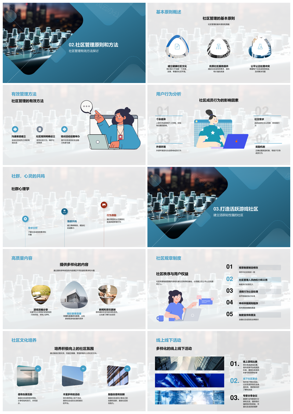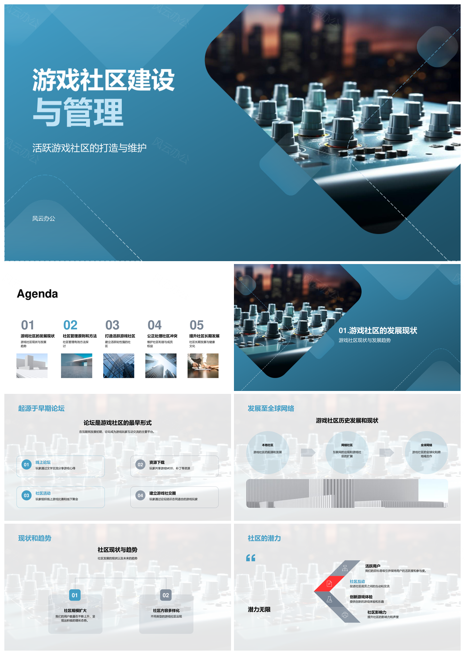 风云办公提供的游戏社区用户行为社群心理建设管理PPT模板,下载格式为pptx,一共29页,作品中文字及图均可以修改和编辑,图片更改请在作品中右键图片并更换,文字修改请直接点击文字进行修改。