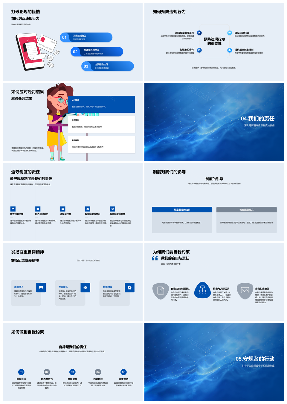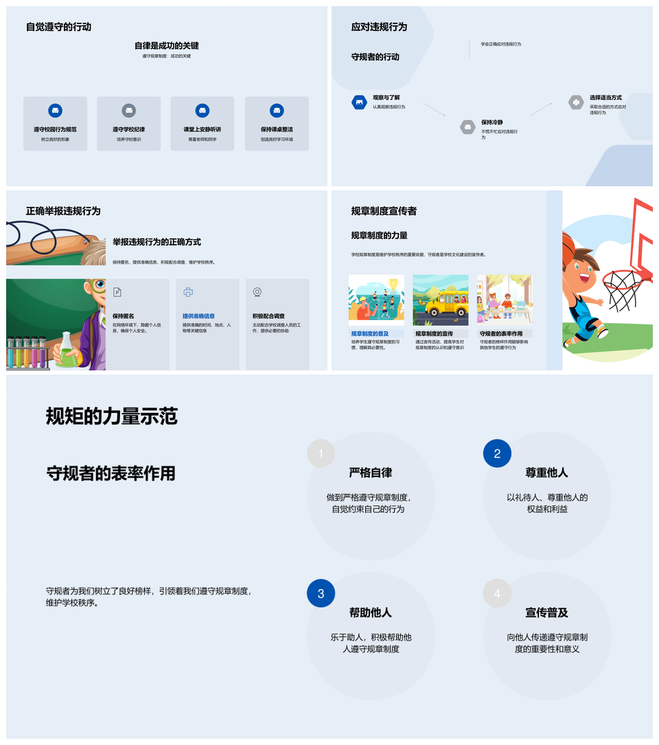 这是一张学校规章制度自律礼仪六年级师生教育培训PPT模板,包含学校、规章制度、自律、礼仪、六年级、师生、教育培训等主题内容,也可用作学校规章制度自律礼仪六年级师生教育培训、学校规章制度自律礼仪教育、学校规章制度自律礼仪培训、六年级师生教育培训自律礼仪、学校规章制度师生教育培训、六年级师生自律礼仪教育、学校自律礼仪教育培训、规章制度自律礼仪教育、六年级师生自律礼仪培训、师生教育培训自律礼仪、规章制度师生教育培训、学校六年级师生教育、自律礼仪教育培训、师生自律礼仪教育、学校规章制度教育等PPT场景使用。 风云办公提供的学校规章制度自律礼仪六年级师生教育培训PPT模板,下载格式为pptx,一共33页,作品中文字及图均可以修改和编辑,图片更改请在作品中右键图片并更换,文字修改请直接点击文字进行修改。