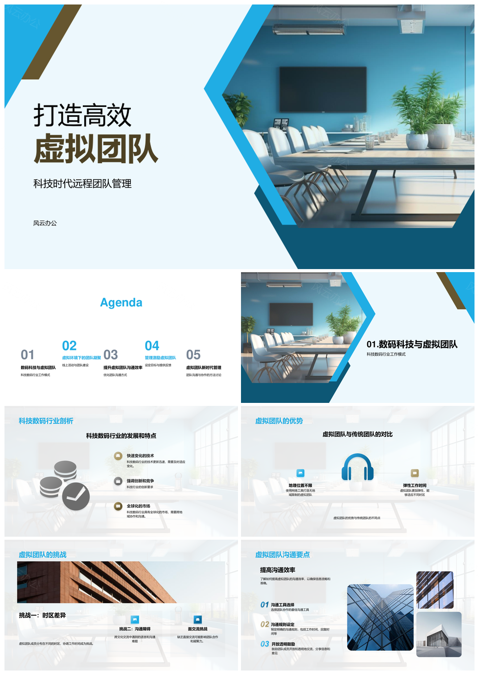 风云办公提供的科技数码虚拟团队高效管理建设PPT模板,下载格式为pptx,一共25页,作品中文字及图均可以修改和编辑,图片更改请在作品中右键图片并更换,文字修改请直接点击文字进行修改。