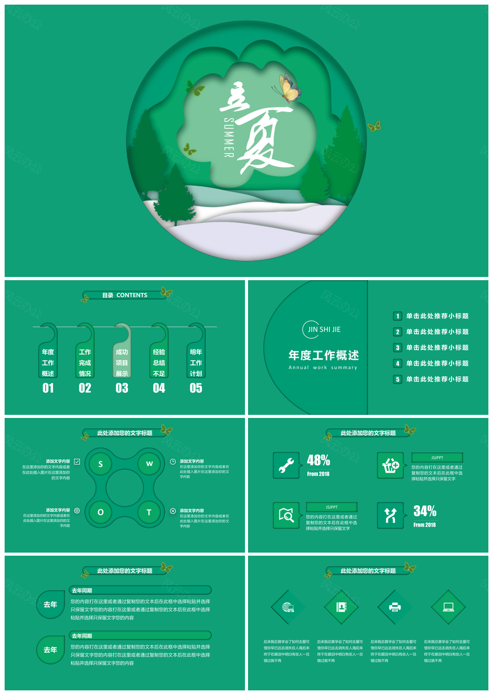 这是一张绿色立夏小清新总结汇报计划报告通用ppt模板通用PPT模板,包含绿色、立夏、小清新、总结、汇报、计划、报告等主题内容,也可用作绿色立夏小清新模板、立夏小清新总结汇报、小清新总结汇报计划、总结汇报计划报告、汇报计划报告通用、计划报告通用模板、绿色立夏总结汇报、立夏小清新计划、小清新汇报计划、绿色通用模板、立夏总结汇报、小清新计划报告、汇报计划通用、报告通用模板、绿色立夏模板、总结汇报报告、计划通用模板、绿色小清新模板、立夏计划报告、总结计划报告、汇报报告模板、绿色汇报计划、小清新通用模板、总结通用模板、绿色计划报告、小清新总结模板、总结报告模板、汇报通用模板、绿色总结汇报、小清新计划模板、总结汇报模板、汇报计划模板、计划报告模板、报告模板通用、小清新总结报告、总结计划模板、绿色计划模板、小清新报告通用、总结模板通用、立夏报告模板、计划报告通用等PPT场景使用。 风云办公提供的绿色立夏小清新总结汇报计划报告通用ppt模板通用PPT模板,下载格式为pptx,一共29页,作品中文字及图均可以修改和编辑,图片更改请在作品中右键图片并更换,文字修改请直接点击文字进行修改。