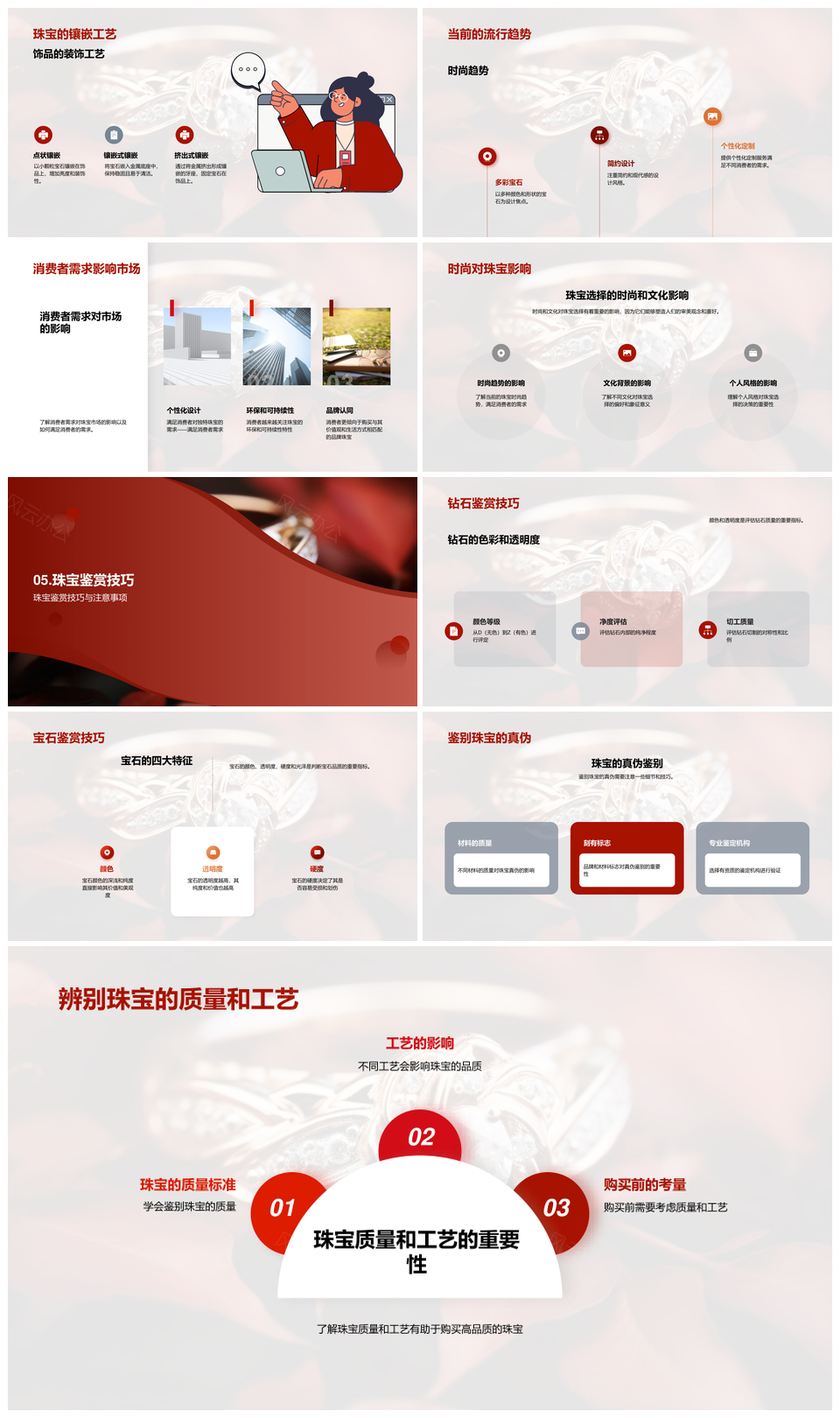 这是一张消费者珠宝鉴赏技巧与成色材料克拉解析PPT模板,包含消费者、珠宝、鉴赏技巧、成色、材料、克拉、解析等主题内容,也可用作消费者珠宝鉴赏技巧与成色材料克拉解析、消费者珠宝鉴赏技巧成色、珠宝鉴赏技巧成色材料、鉴赏技巧成色材料克拉、成色材料克拉解析、消费者珠宝成色材料、珠宝成色材料克拉、消费者鉴赏技巧成色、珠宝鉴赏成色材料、鉴赏技巧材料解析、成色材料解析、消费者珠宝鉴赏、珠宝成色材料、鉴赏技巧成色、材料克拉解析、成色材料克拉等PPT场景使用。 风云办公提供的消费者珠宝鉴赏技巧与成色材料克拉解析PPT模板,下载格式为pptx,一共27页,作品中文字及图均可以修改和编辑,图片更改请在作品中右键图片并更换,文字修改请直接点击文字进行修改。