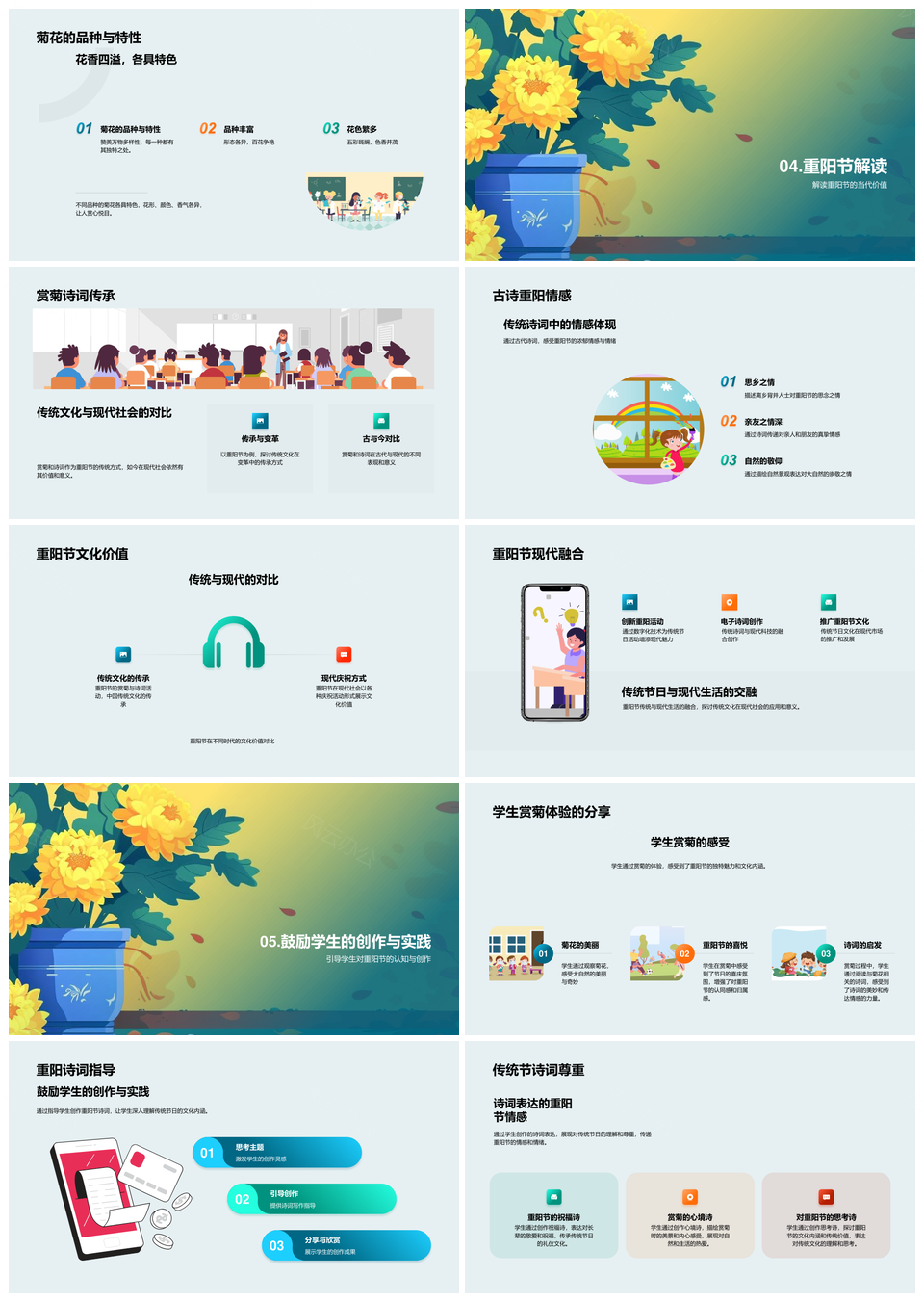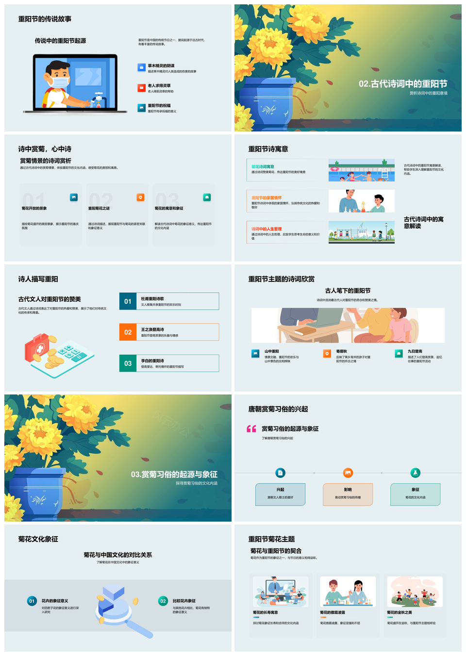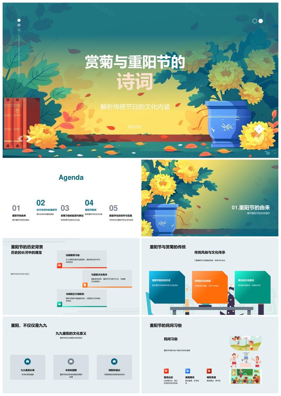 这是一张2025重阳赏菊诗词文化历史内涵传统PPT模板,包含2025、重阳、赏菊、诗词、文化、历史、内涵、传统等主题内容,也可用作2025重阳赏菊诗词文化历史内涵传统、2025重阳赏菊诗词文化、重阳赏菊诗词文化历史、赏菊诗词文化历史内涵、诗词文化历史内涵传统、2025重阳赏菊诗词、重阳赏菊诗词文化、赏菊诗词文化历史、诗词文化历史内涵、文化历史内涵传统、2025重阳赏菊、重阳赏菊诗词、赏菊诗词文化、诗词文化历史、文化历史内涵等PPT场景使用。 风云办公提供的2025重阳赏菊诗词文化历史内涵传统PPT模板,下载格式为pptx,一共29页,作品中文字及图均可以修改和编辑,图片更改请在作品中右键图片并更换,文字修改请直接点击文字进行修改。