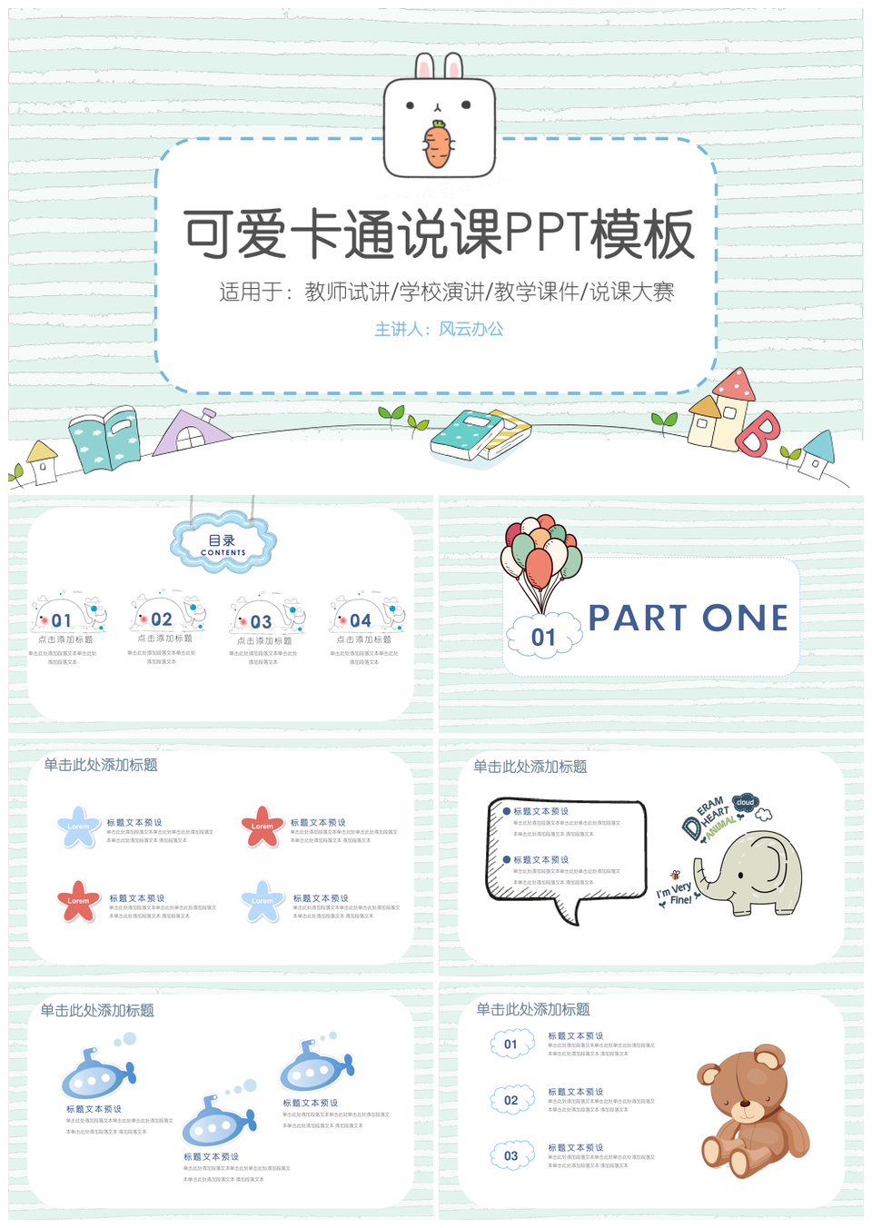 粉蓝色可爱卡通儿童说课教育PPT模板