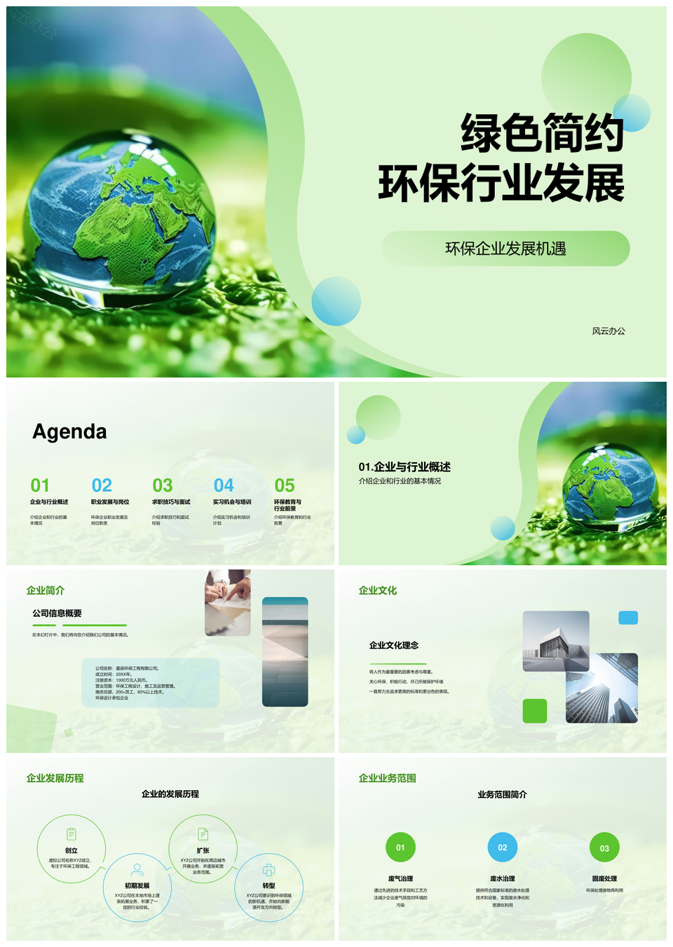 风云办公提供的绿色环保商务现代行业发展培训课件,下载格式为pptx,一共23页,作品中文字及图均可以修改和编辑,图片更改请在作品中右键图片并更换,文字修改请直接点击文字进行修改。