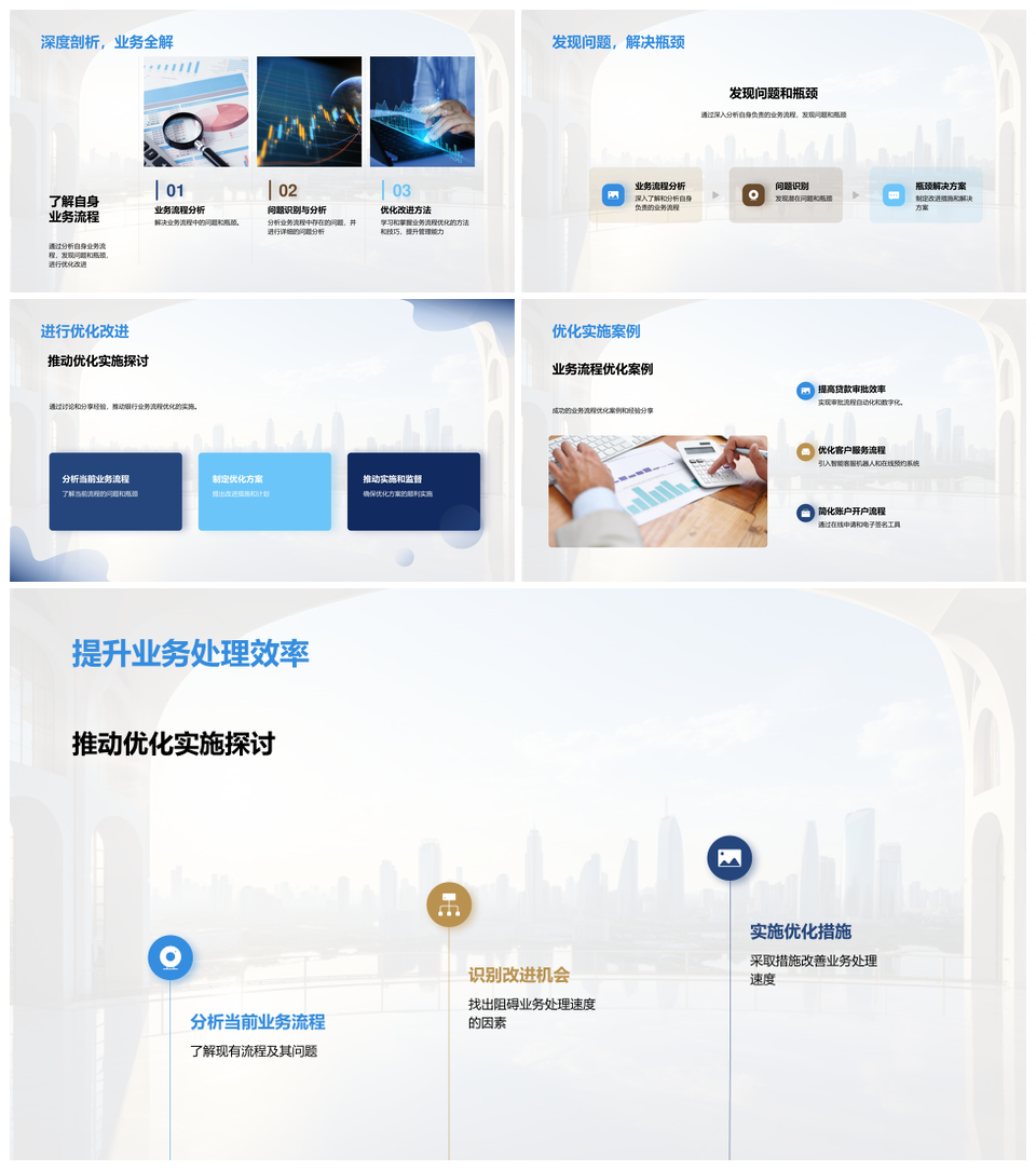 这是一张银行业务流程优化方法效率服务案例分享PPT模板,包含银行业务流程、优化、方法、效率、服务、案例、分享等主题内容,也可用作银行业务流程优化方法效率、业务流程优化方法效率服务、优化方法效率服务案例、方法效率服务案例分享、银行业务流程优化方法、业务流程优化方法效率、优化方法效率服务、方法效率服务案例、效率服务案例分享、银行业务流程优化、业务流程优化方法、优化方法效率、方法效率服务、效率服务案例、服务案例分享等PPT场景使用。 风云办公提供的银行业务流程优化方法效率服务案例分享PPT模板,下载格式为pptx,一共33页,作品中文字及图均可以修改和编辑,图片更改请在作品中右键图片并更换,文字修改请直接点击文字进行修改。