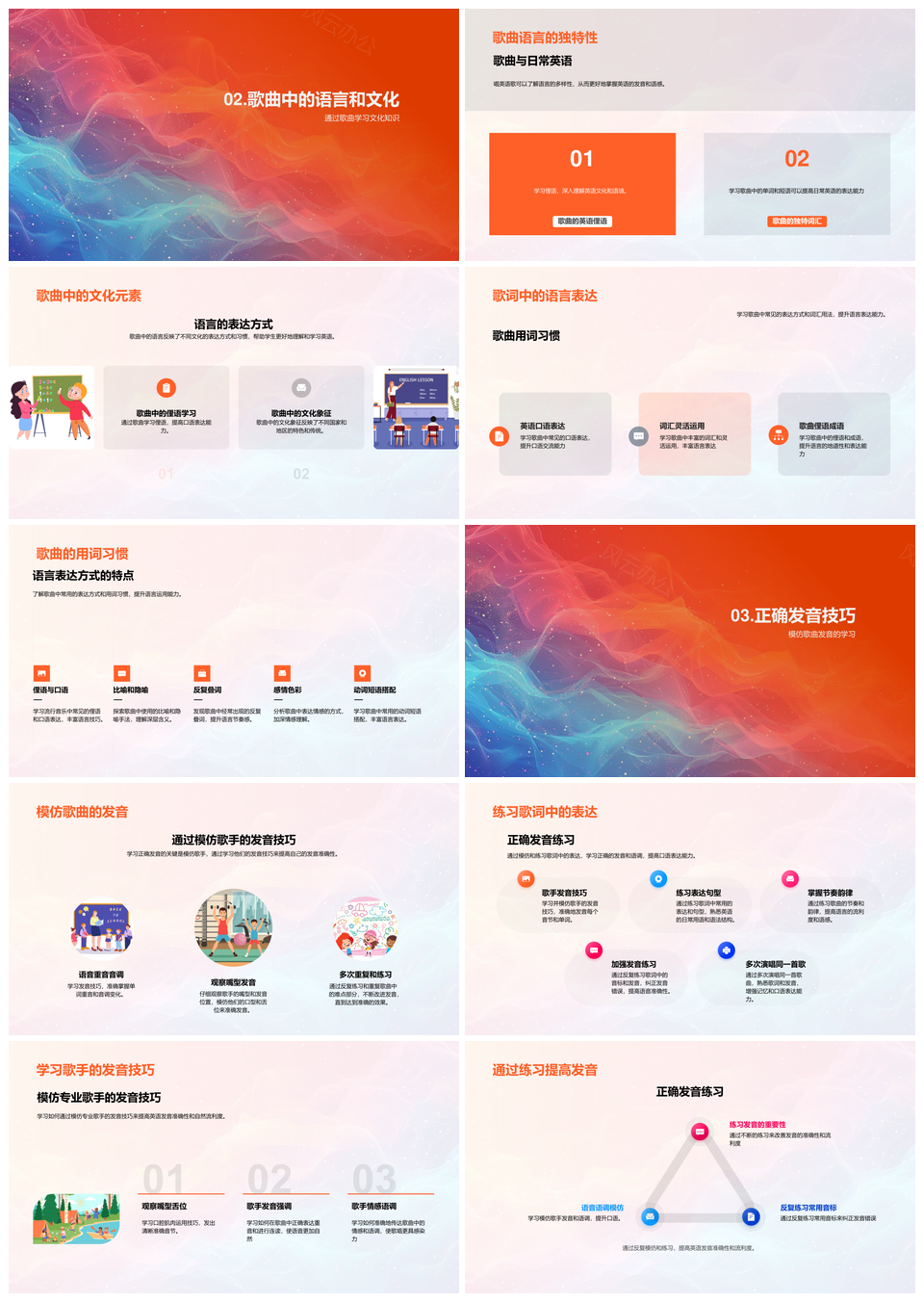 这是一张英语歌曲教学语言文化旋律节奏趣味解析PPT模板,包含英语歌曲、教学、语言、文化、旋律、节奏、趣味、解析等主题内容,也可用作英语歌曲教学语言文化、歌曲教学语言文化旋律、教学语言文化旋律节奏、语言文化旋律节奏趣味、文化旋律节奏趣味解析、英语歌曲语言文化旋律、歌曲语言文化旋律节奏、语言文化旋律节奏解析、英语歌曲教学语言旋律、教学语言文化节奏趣味、英语教学文化旋律节奏、歌曲教学旋律趣味解析、英语语言节奏趣味解析、教学文化旋律解析、节奏趣味解析等PPT场景使用。 风云办公提供的英语歌曲教学语言文化旋律节奏趣味解析PPT模板,下载格式为pptx,一共28页,作品中文字及图均可以修改和编辑,图片更改请在作品中右键图片并更换,文字修改请直接点击文字进行修改。