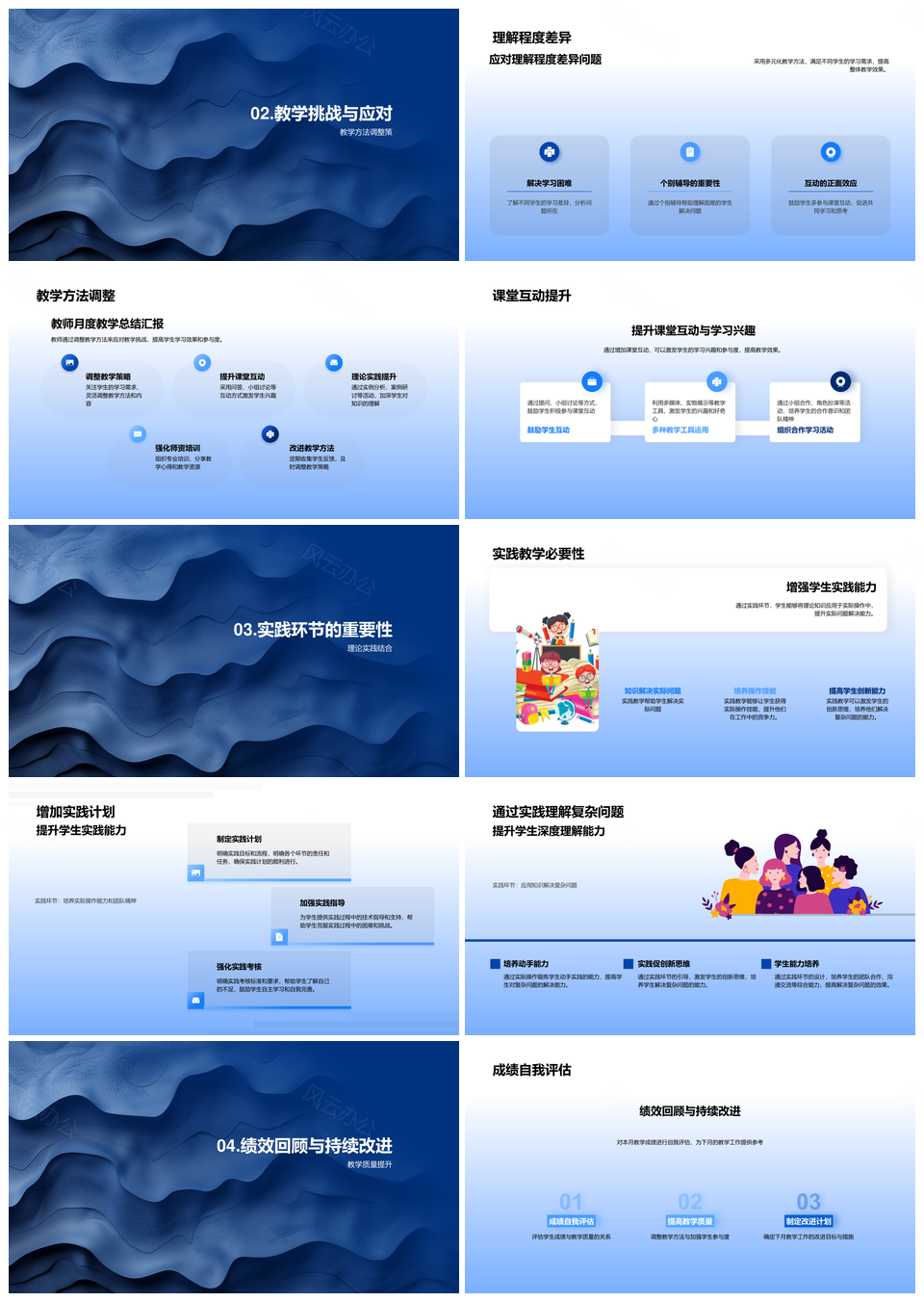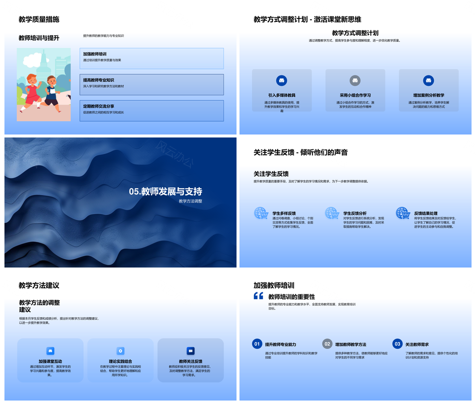 这是一张教学成效调整策略学情反馈成绩互动实践培训报告PPT模板,包含教学成效、调整策略、学情反馈、成绩互动、实践培训、报告等主题内容,也可用作教学成效调整策略、学情反馈成绩互动、互动实践培训报告、培训报告教学成效、教学策略学情反馈、调整策略学情反馈、学情反馈成绩实践、成绩互动实践培训、实践培训报告调整、成效调整策略学情、策略学情反馈成绩、反馈成绩互动实践、教学成效学情反馈、学情反馈实践培训、成绩互动实践报告等PPT场景使用。 风云办公提供的教学成效调整策略学情反馈成绩互动实践培训报告PPT模板,下载格式为pptx,一共24页,作品中文字及图均可以修改和编辑,图片更改请在作品中右键图片并更换,文字修改请直接点击文字进行修改。