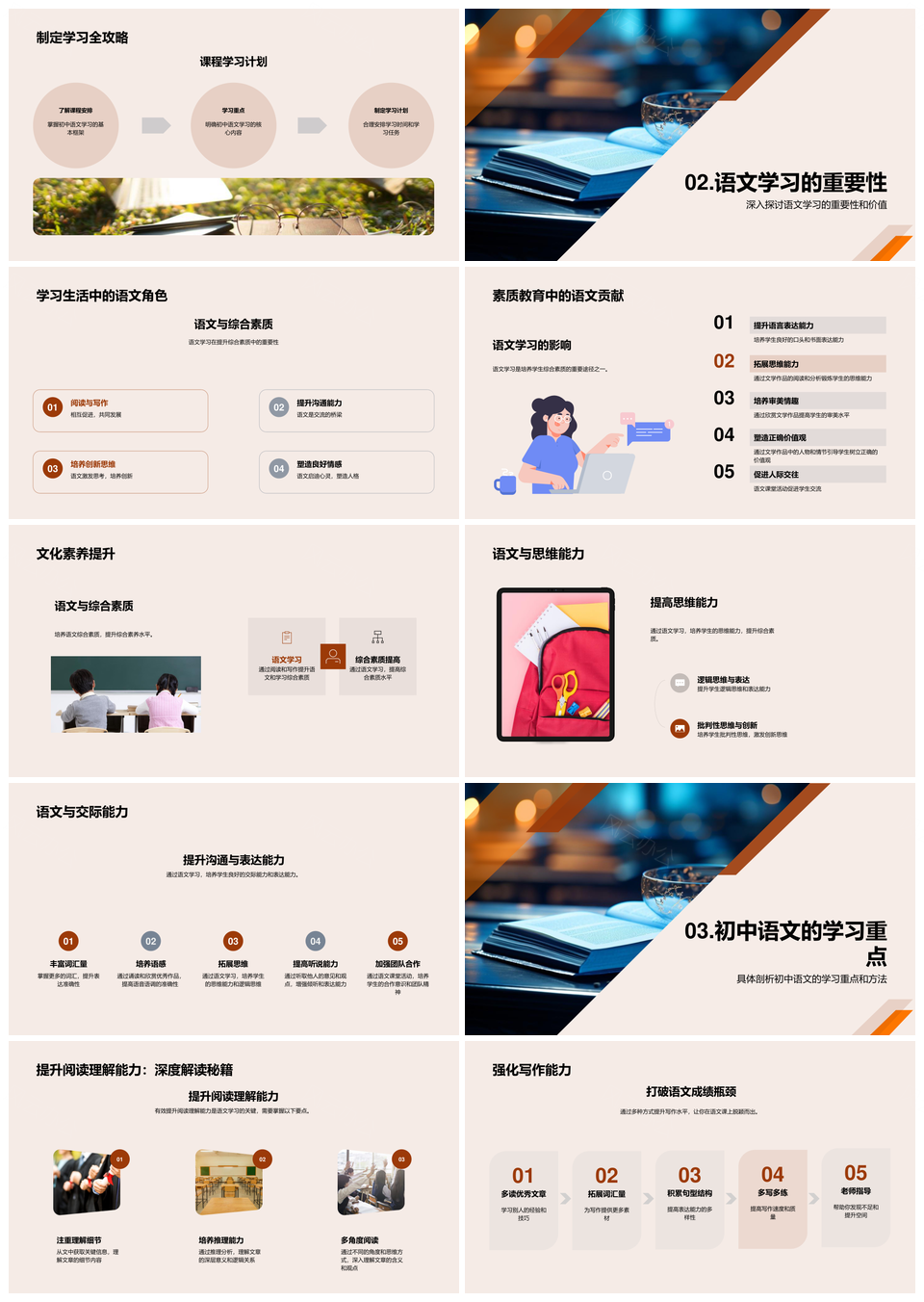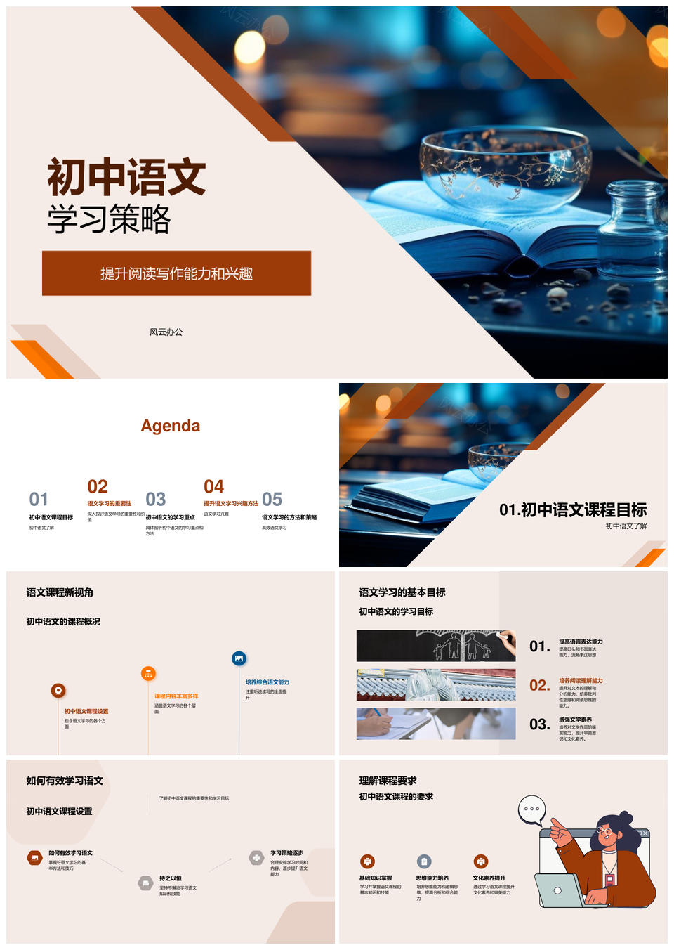 风云办公提供的初中语文学习策略与写作阅读提升PPT模板,下载格式为pptx,一共33页,作品中文字及图均可以修改和编辑,图片更改请在作品中右键图片并更换,文字修改请直接点击文字进行修改。