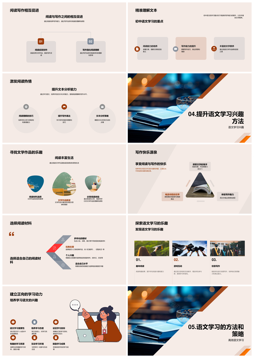 这是一张初中语文学习策略与写作阅读提升PPT模板,包含初中语文、学习策略、写作、阅读、提升等主题内容,也可用作初中语文学习策略、语文学习策略写作阅读、初中语文写作阅读提升、学习策略写作阅读提升、初中语文阅读提升、语文写作阅读提升、初中写作阅读提升、语文学习写作阅读、学习策略提升、写作阅读提升、初中语文学习、初中语文写作、语文学习策略、学习写作阅读、初中语文、语文学习、学习策略、写作阅读、阅读提升、初中写作等PPT场景使用。