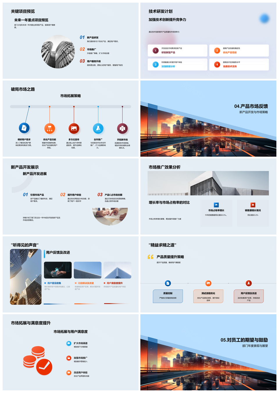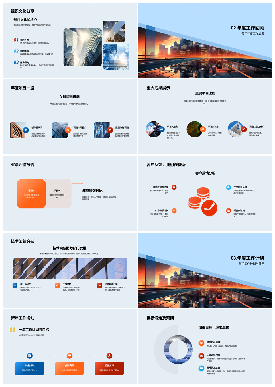 这款模板采用天蓝至深蓝渐变为主色,搭配亮橙色点缀,形成科技与活力的视觉平衡,页面以极简线条、几何模块构建,去除冗余设计元素,呈现数字化的理性美感。智能图表支持数据动态展示,适配人工智能、云计算等主题,内置浅色底图与无衬线字体,确保职场汇报的专业性与可读性。20张版式覆盖架构图、流程图等商务场景,支持自定义配色,满足数字化转型、技术方案路演等需求,兼顾视觉冲击力与信息传递效率,帮助使用者建立沉稳可靠的科技型品牌形象。