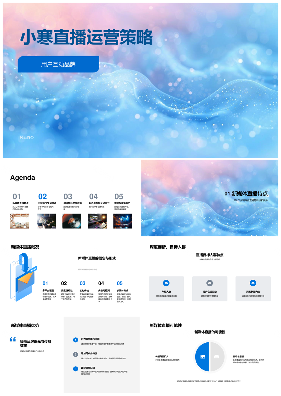 风云办公提供的小寒直播运营策略主播互动提升观看率PPT模板,下载格式为pptx,一共24页,作品中文字及图均可以修改和编辑,图片更改请在作品中右键图片并更换,文字修改请直接点击文字进行修改。