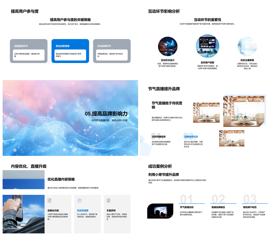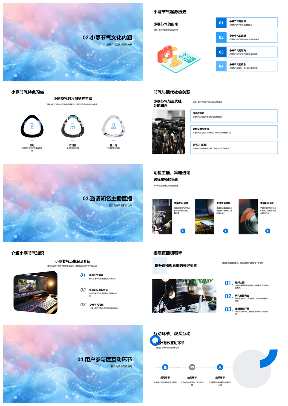 这是一张小寒直播运营策略主播互动提升观看率PPT模板,包含小寒、直播、运营策略、主播、互动、提升、观看率等主题内容,也可用作小寒直播运营策略主播互动、运营策略主播互动提升、主播互动提升观看率、直播运营策略主播互动、小寒直播主播互动、直播运营策略互动提升、运营策略互动提升观看率、小寒直播运营策略、直播运营策略主播、运营策略主播互动、主播互动提升、互动提升观看率、直播运营策略、主播互动、提升观看率等PPT场景使用。