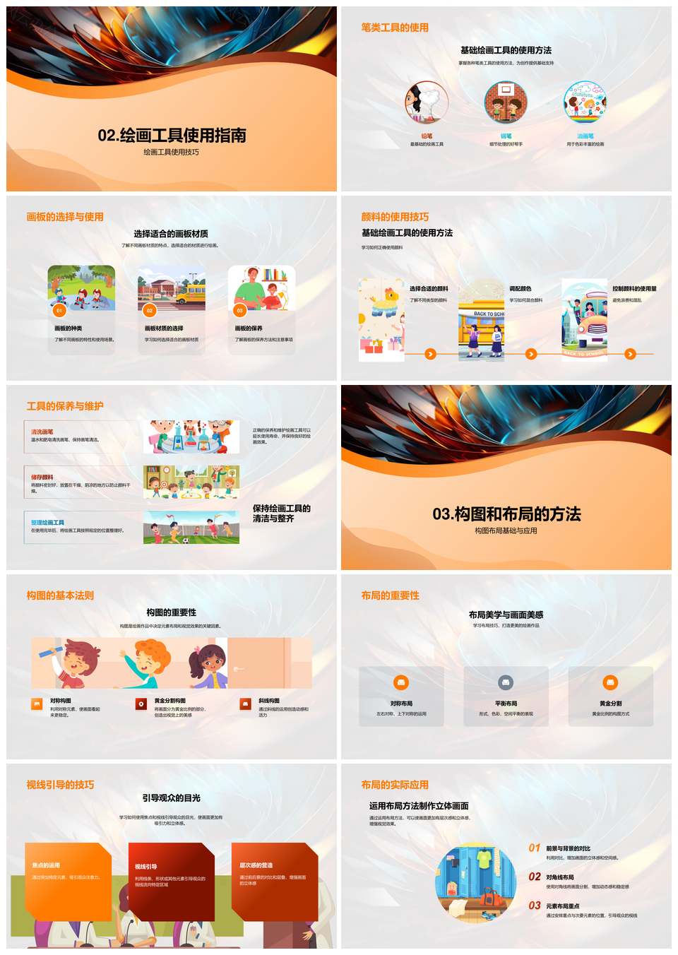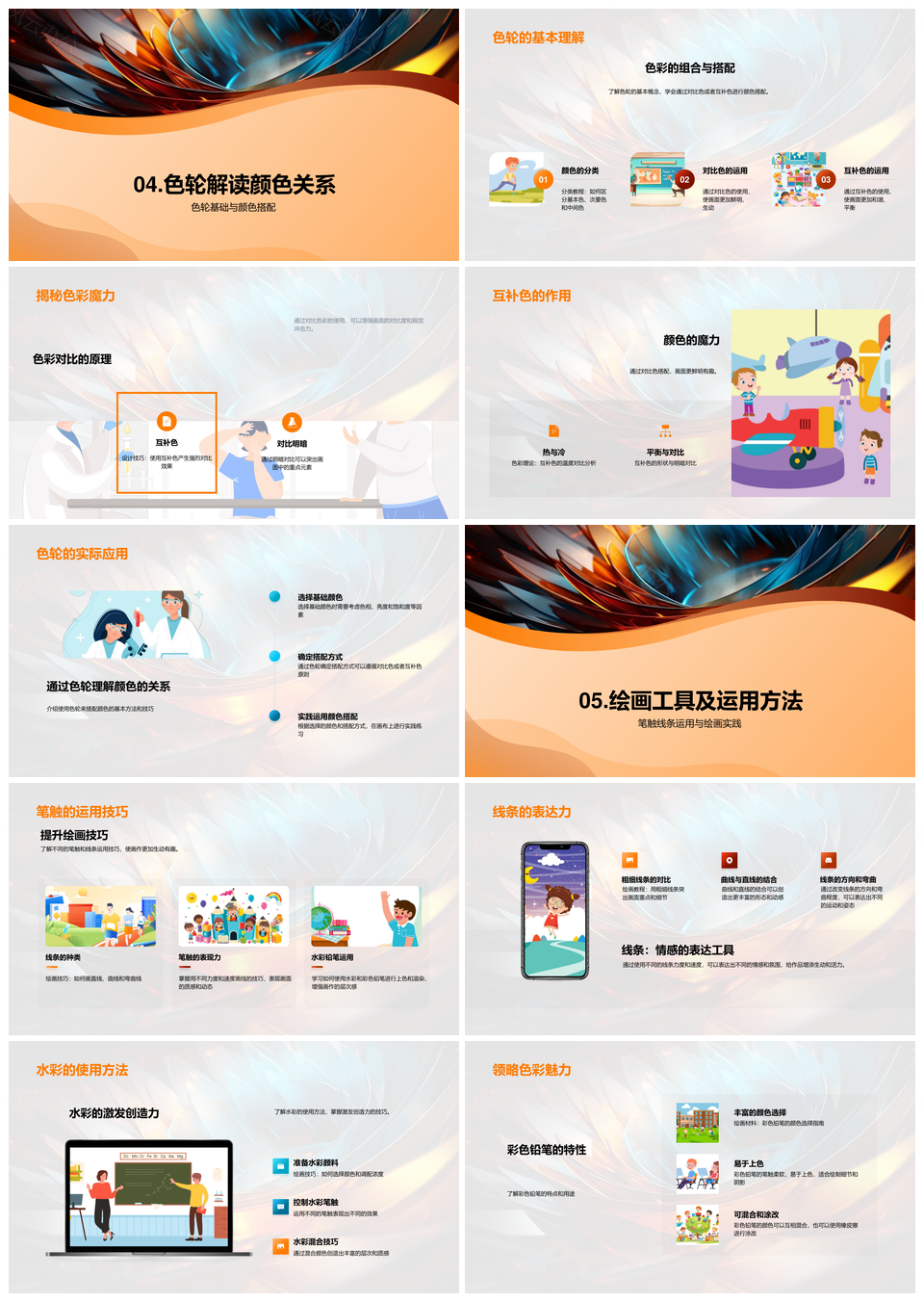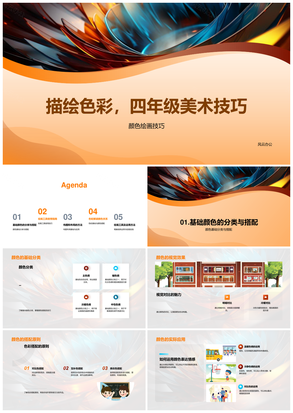 风云办公提供的四年级美术色彩搭配与色轮基础技巧PPT模板,下载格式为pptx,一共29页,作品中文字及图均可以修改和编辑,图片更改请在作品中右键图片并更换,文字修改请直接点击文字进行修改。