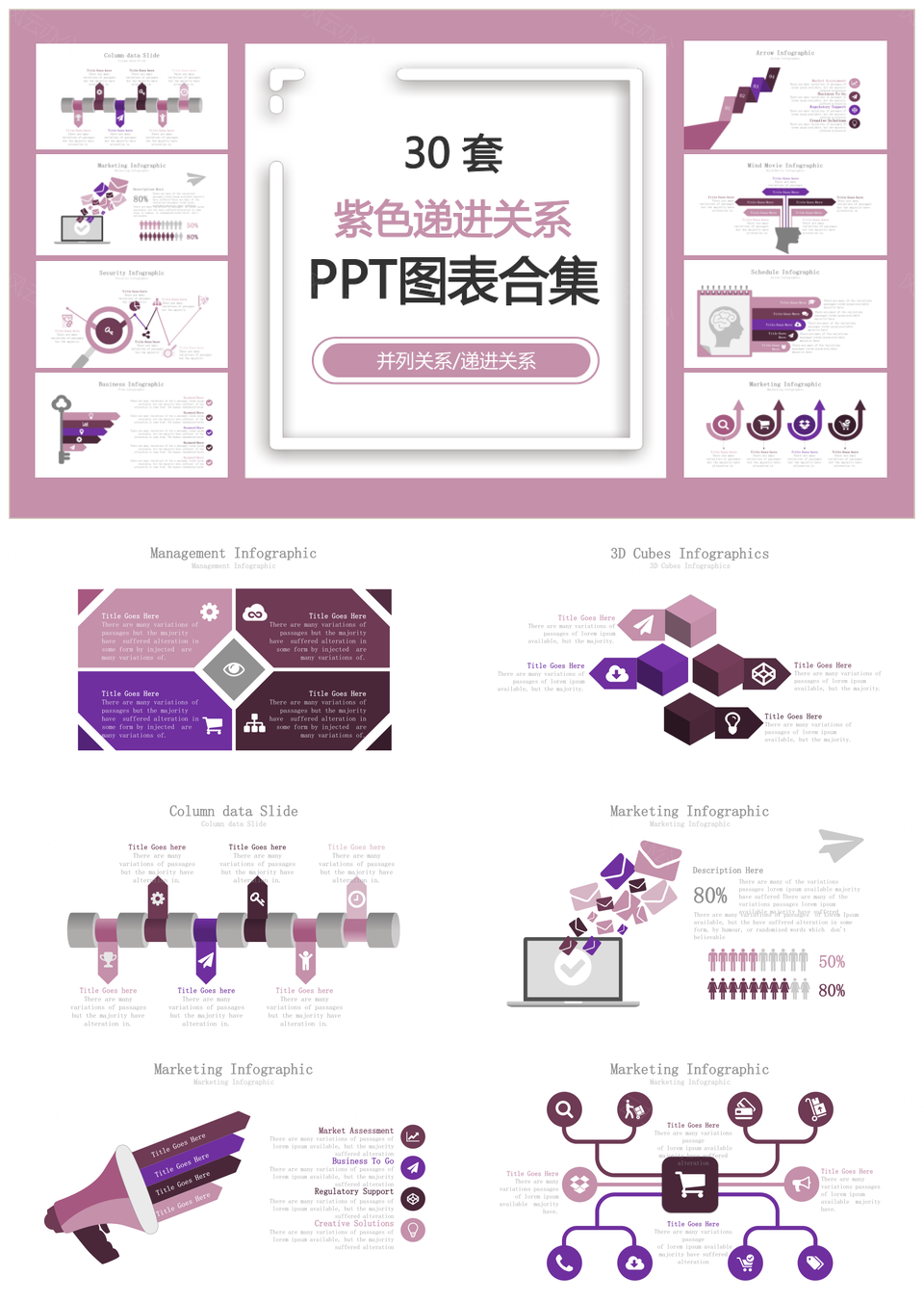 这是一张紫色递进关系并列关系递进关系PPT图表合集,包含紫色、递进关系、并列关系、图表合集等主题内容,也可用作紫色、递进关系、并列关系、PPT、图表、合集
