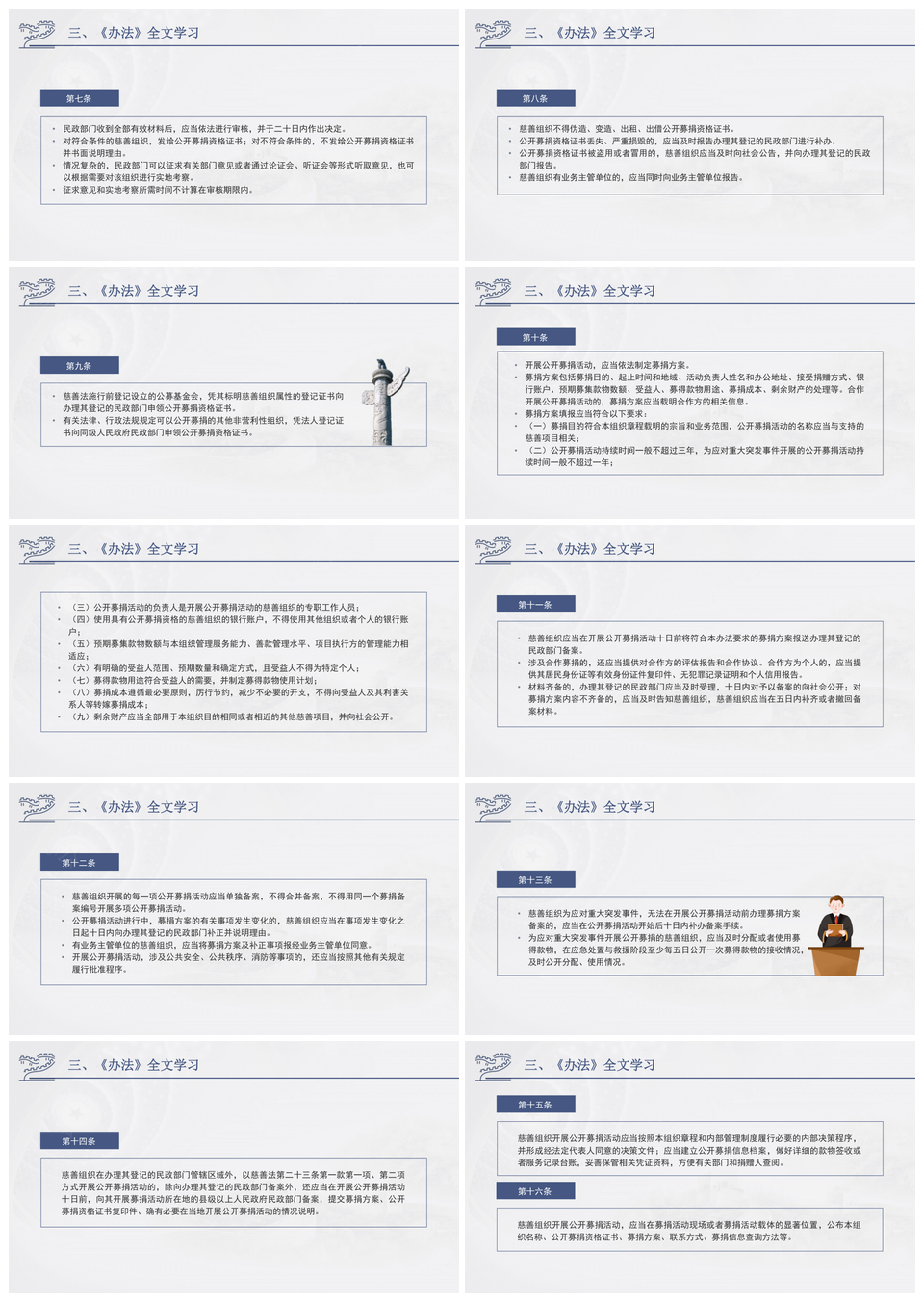 这是一张2024慈善组织公开募捐管理办法解读PPT课件,包含2024、慈善组织、公开募捐、管理办法、解读、课件等主题内容,也可用作2024、慈善组织、公开募捐、管理办法、解读、PPT、课件 2024慈善组织公开募捐管理办法、慈善组织公开募捐管理办法解读、公开募捐管理办法解读PPT、管理办法解读PPT课件、慈善组织公开募捐管理办法、公开募捐管理办法解读、管理办法解读PPT、解读PPT课件、慈善组织公开募捐、公开募捐管理办法、管理办法解读、解读PPT、PPT课件等PPT场景使用。 风云办公提供的2024慈善组织公开募捐管理办法解读PPT课件,下载格式为pptx,一共39页,作品中文字及图均可以修改和编辑,图片更改请在作品中右键图片并更换,文字修改请直接点击文字进行修改。