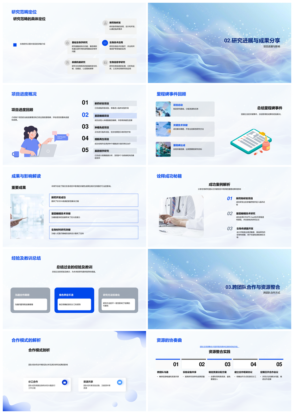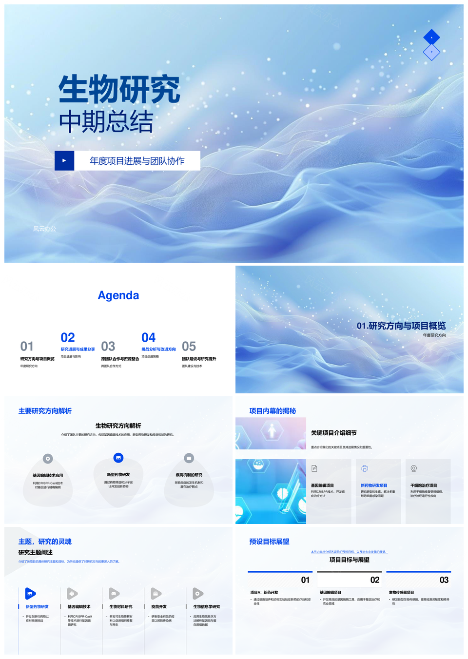 风云办公提供的生物研究关键项目进展协作共享里程碑PPT模板,下载格式为pptx,一共33页,作品中文字及图均可以修改和编辑,图片更改请在作品中右键图片并更换,文字修改请直接点击文字进行修改。
