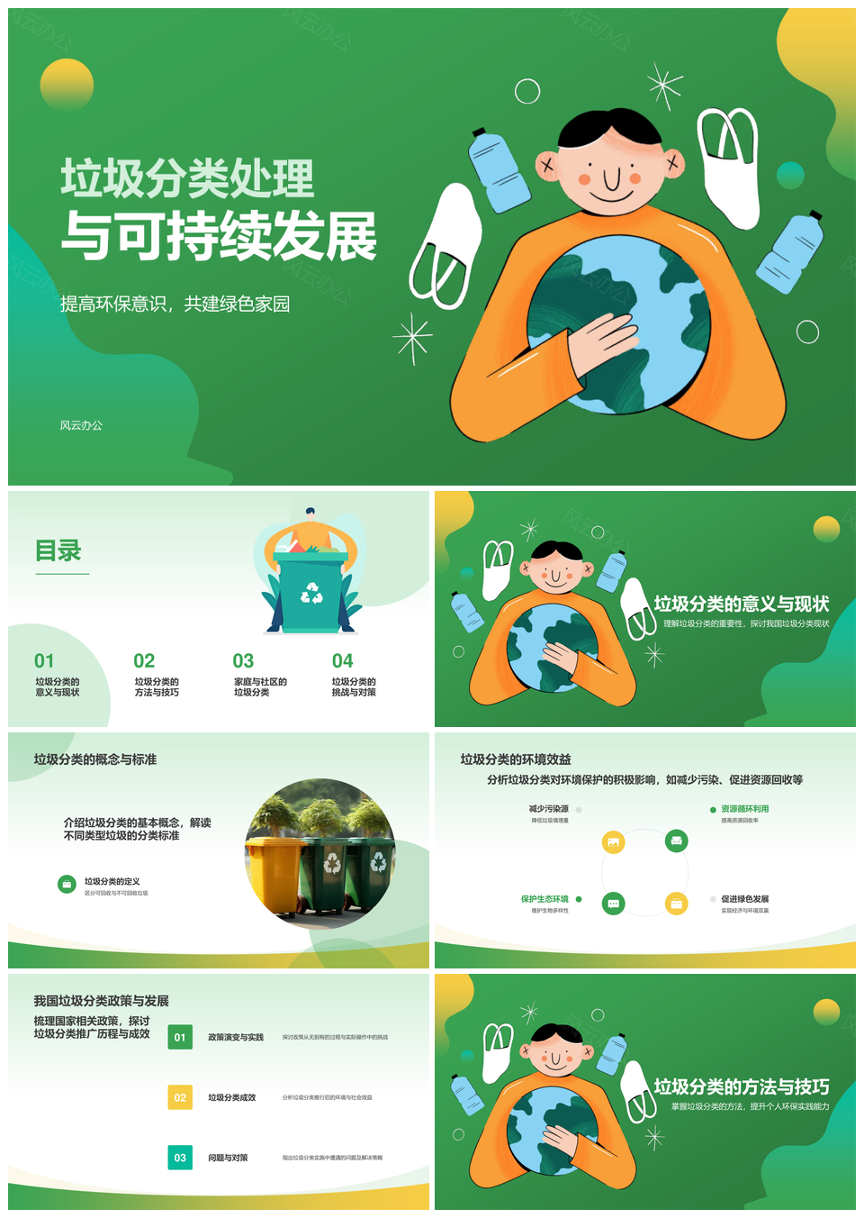 风云办公提供的绿色插画垃圾分类环保循环模板,下载格式为pptx,一共20页,作品中文字及图均可以修改和编辑,图片更改请在作品中右键图片并更换,文字修改请直接点击文字进行修改。