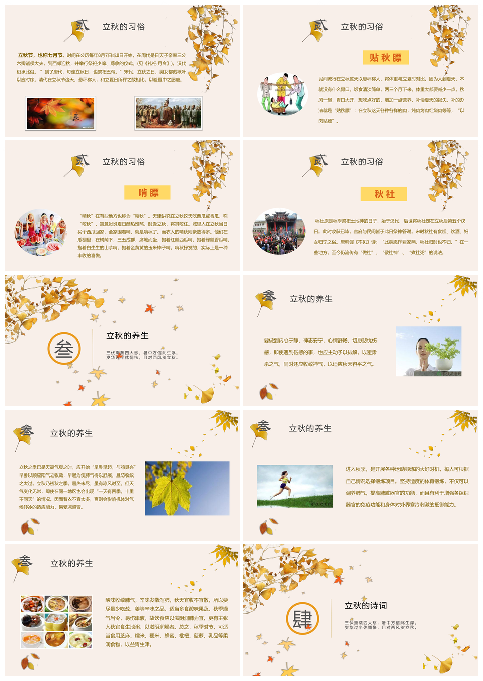 这是一张复古简约立秋节气介绍PPT模板,包含复古、简约、立秋、节气、介绍等主题内容,也可用作复古、简约、立秋、节气、介绍 复古简约立秋节气、简约立秋节气介绍、复古立秋节气介绍、复古简约立秋、复古立秋节气、简约立秋节气、立秋节气介绍、复古简约、立秋节气、节气介绍、复古立秋、简约立秋、立秋介绍等PPT场景使用。 风云办公提供的复古简约立秋节气介绍PPT模板,下载格式为pptx,一共10页,作品中文字及图均可以修改和编辑,图片更改请在作品中右键图片并更换,文字修改请直接点击文字进行修改。
