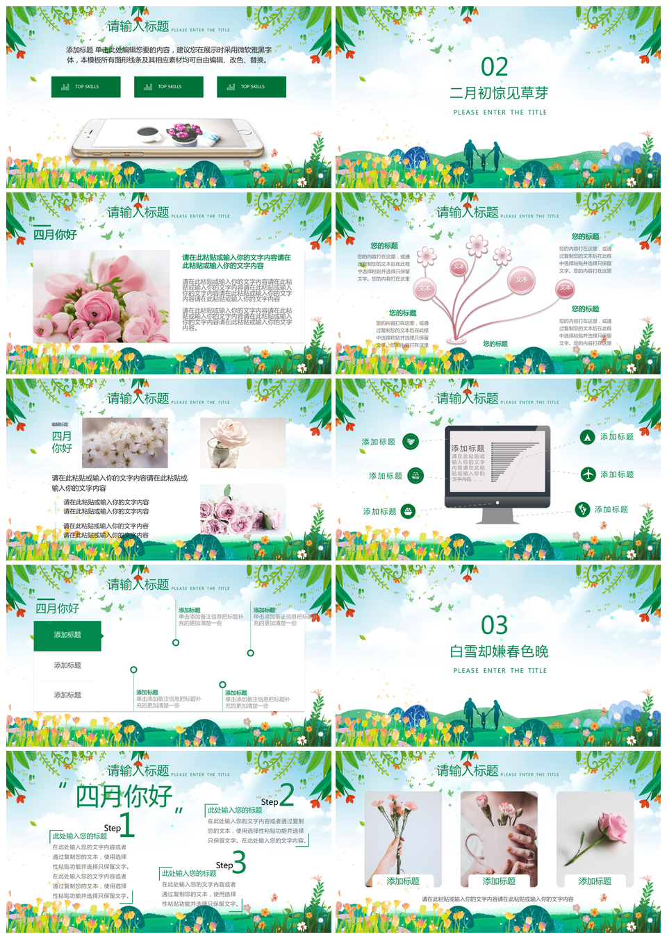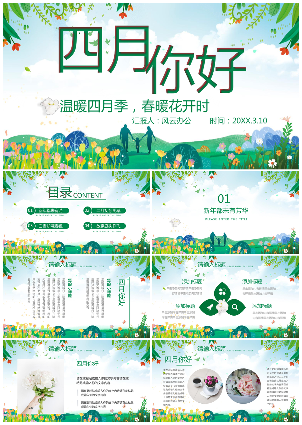 这是一张四月你好清新风工作总结PPT模板,包含四月、你好、清新风、工作总结等主题内容,也可用作四月、你好、清新、工作、总结