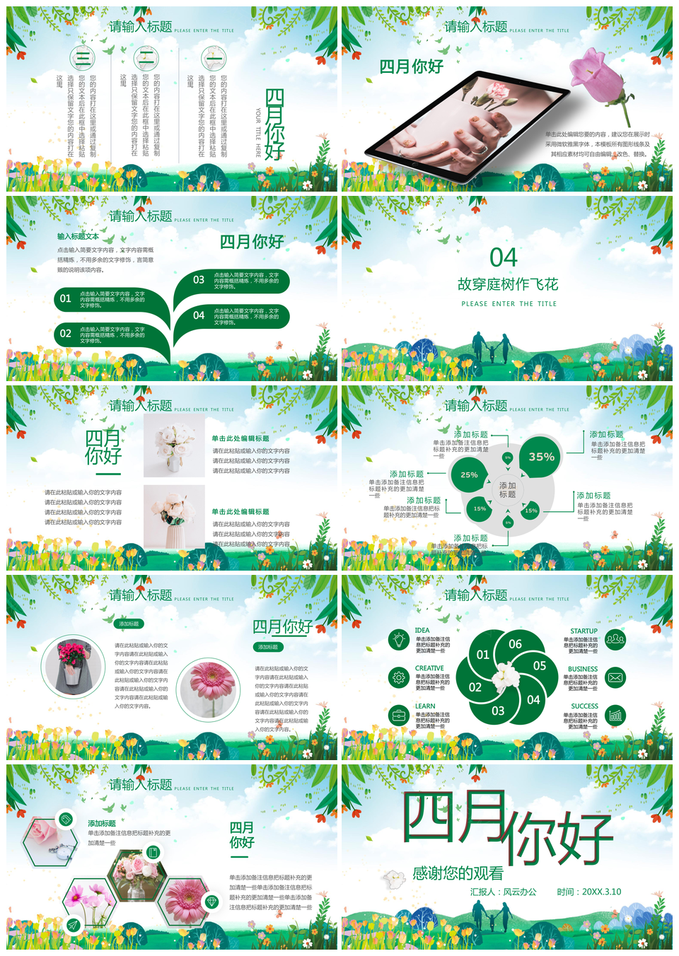 风云办公提供的四月你好清新风工作总结PPT模板,下载格式为pptx,一共20页,作品中文字及图均可以修改和编辑,图片更改请在作品中右键图片并更换,文字修改请直接点击文字进行修改。