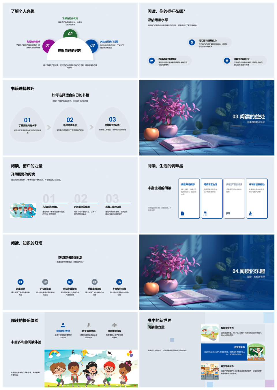这是一张阅读乐趣知识积累成长视野PPT模板,包含阅读、乐趣、知识、积累、成长、视野等主题内容,也可用作阅读乐趣知识积累、乐趣知识积累成长、知识积累成长视野、阅读乐趣知识、乐趣知识积累、知识积累成长、积累成长视野、阅读乐趣、乐趣知识、知识积累、积累成长、成长视野、阅读知识、阅读成长、阅读视野等PPT场景使用。 风云办公提供的阅读乐趣知识积累成长视野PPT模板,下载格式为pptx,一共23页,作品中文字及图均可以修改和编辑,图片更改请在作品中右键图片并更换,文字修改请直接点击文字进行修改。