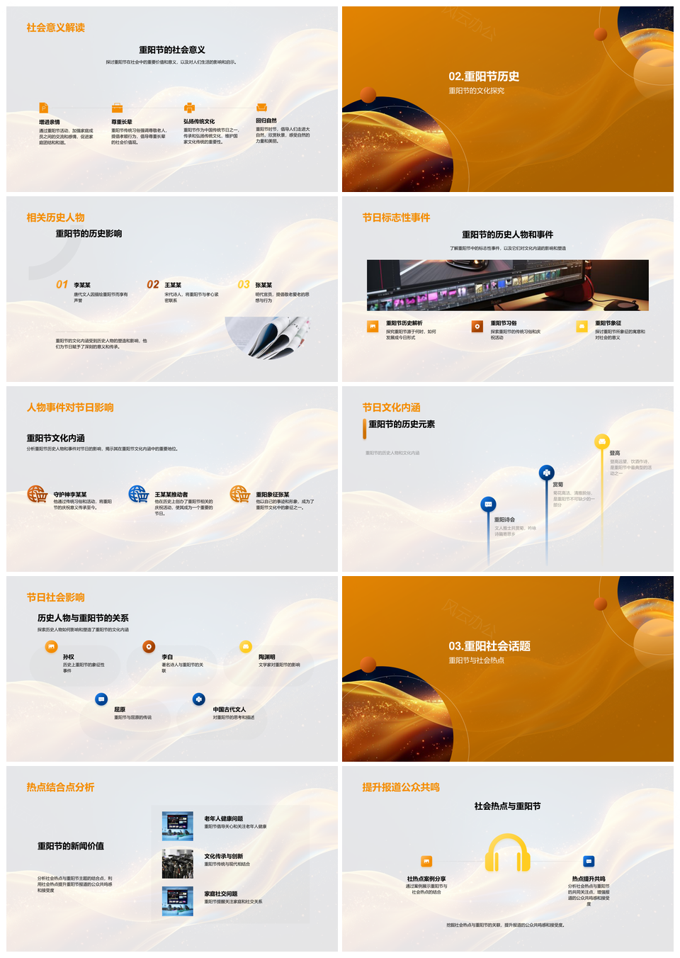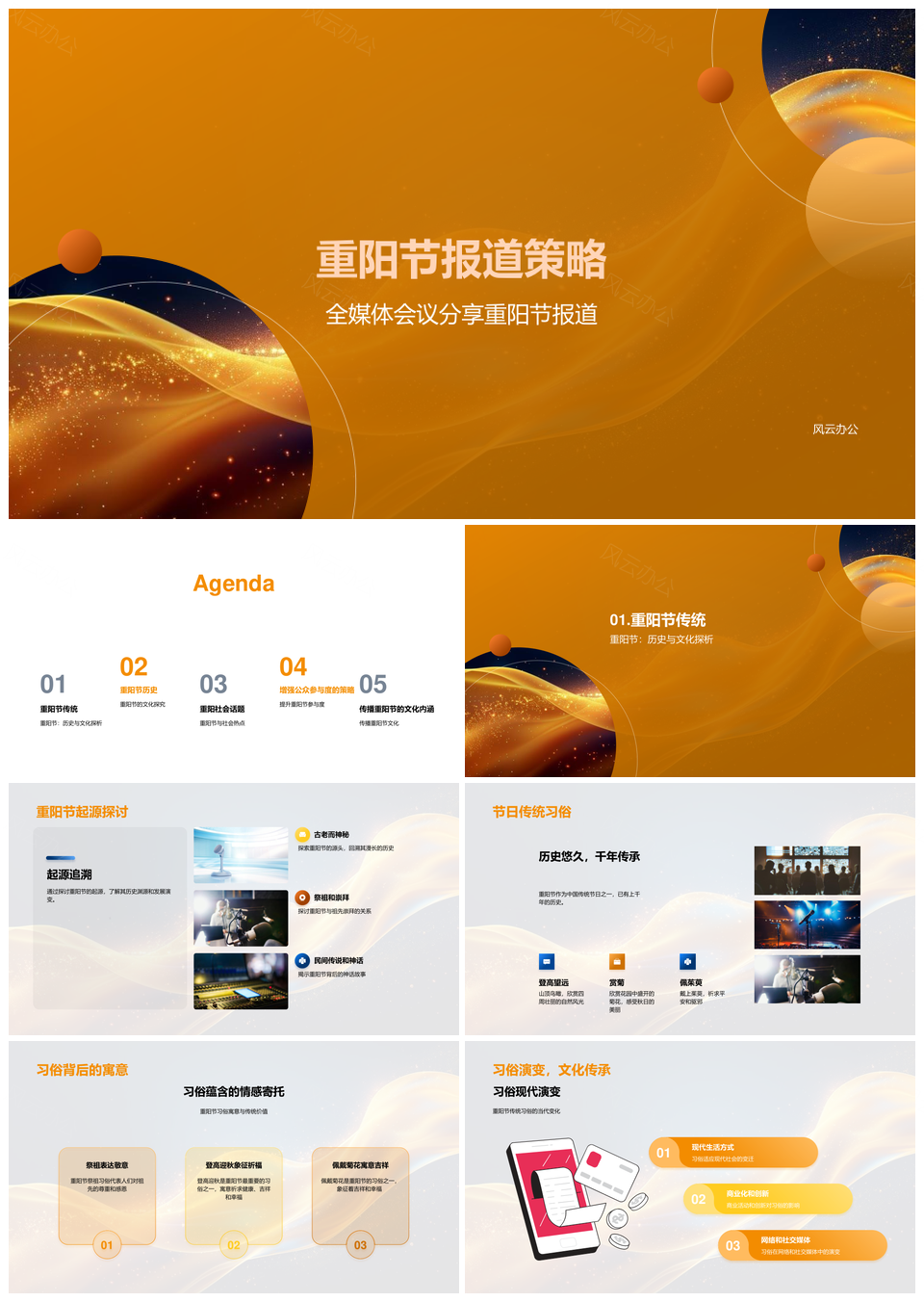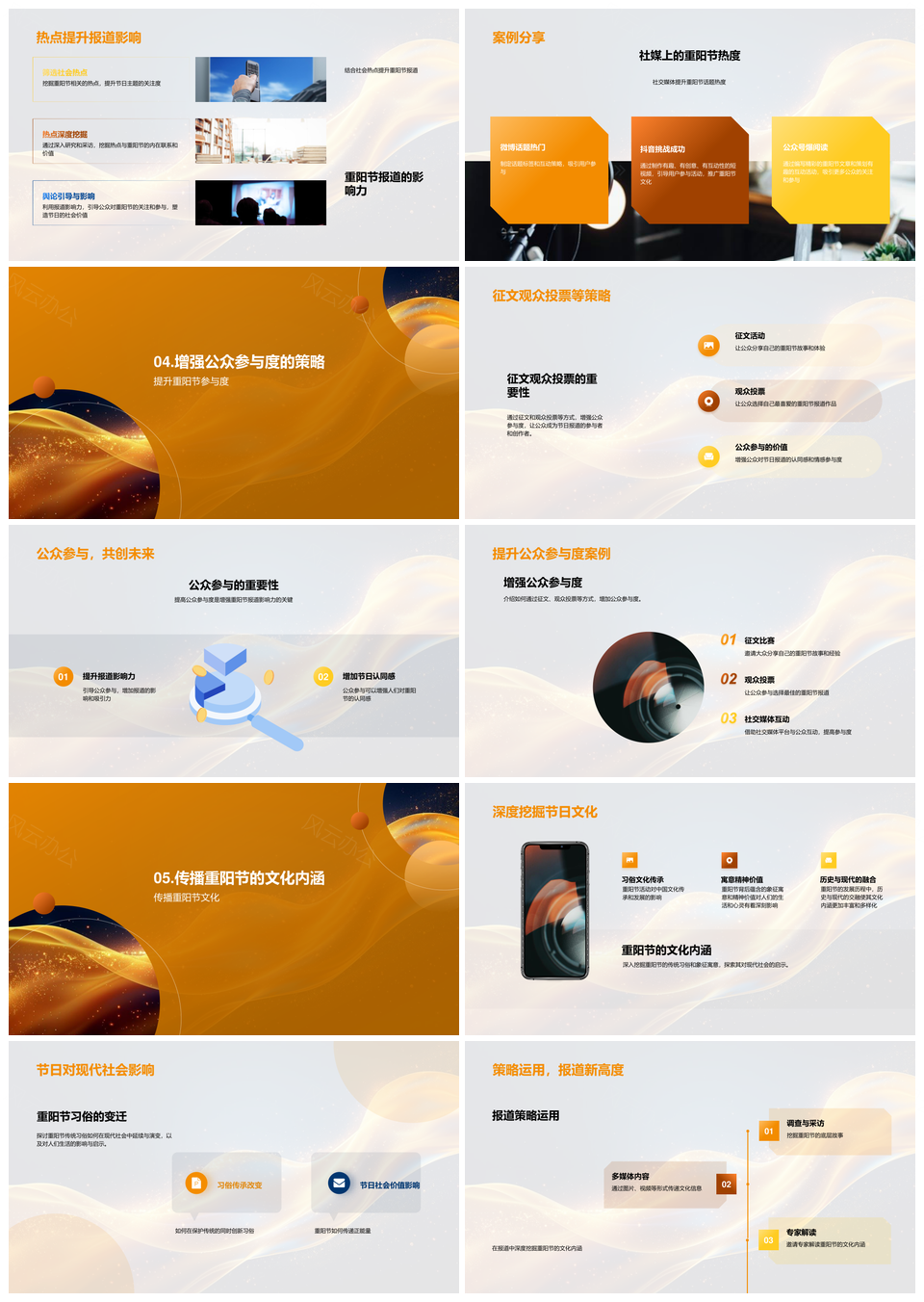 风云办公提供的重阳全媒报道策略文化内涵公众参与PPT模板,下载格式为pptx,一共29页,作品中文字及图均可以修改和编辑,图片更改请在作品中右键图片并更换,文字修改请直接点击文字进行修改。