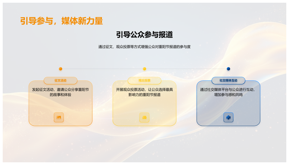 这是一张重阳全媒报道策略文化内涵公众参与PPT模板,包含重阳、全媒、报道、策略、文化、内涵、公众、参与等主题内容,也可用作重阳全媒报道策略、全媒报道策略文化、报道策略文化内涵、策略文化内涵公众、文化内涵公众参与、全媒报道策略、报道策略文化、策略文化内涵、文化内涵公众、内涵公众参与、全媒报道、报道策略、策略文化、文化内涵、公众参与等PPT场景使用。