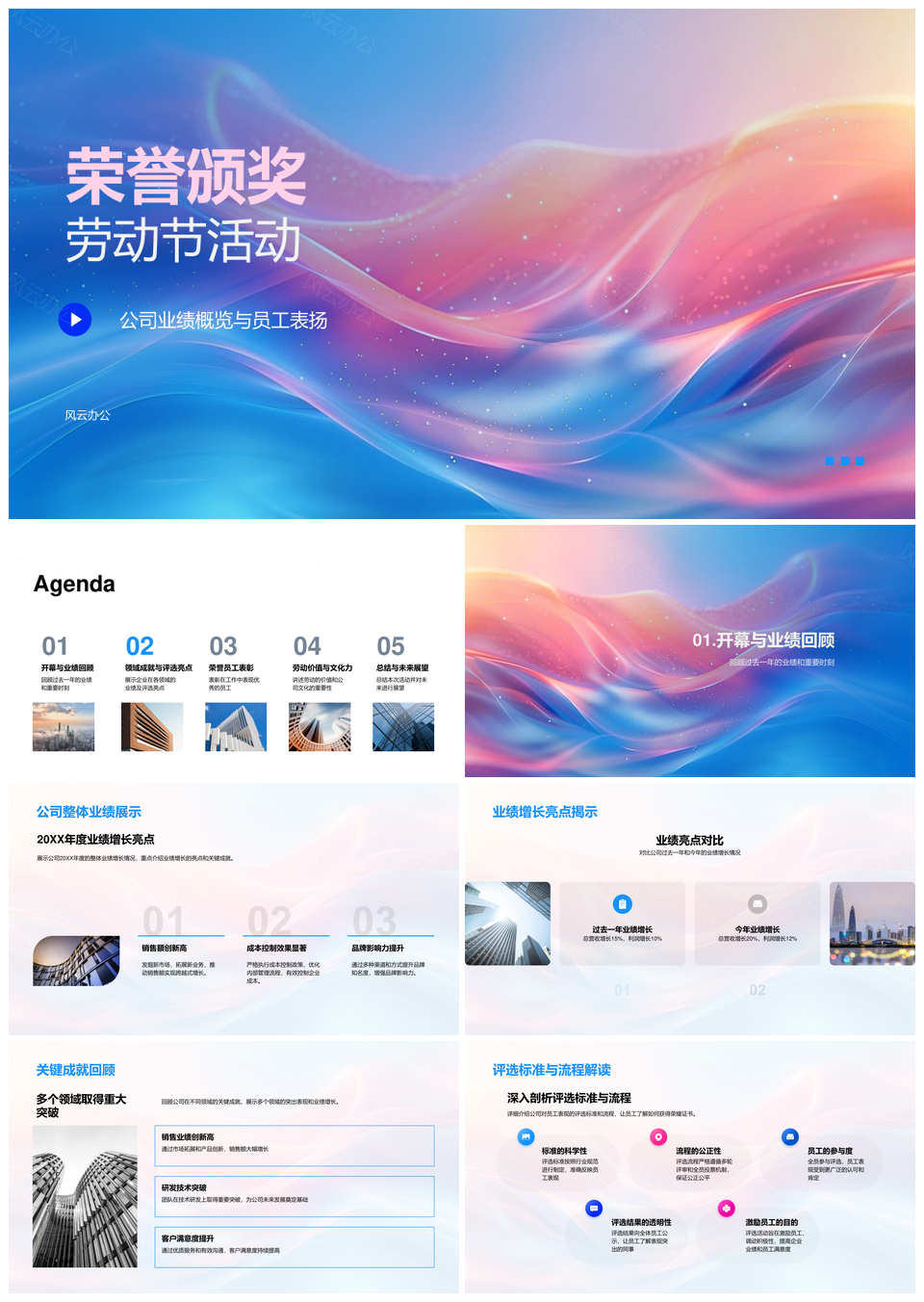 风云办公提供的劳动节荣誉颁奖表扬业绩团队个人贡献PPT模板,下载格式为pptx,一共33页,作品中文字及图均可以修改和编辑,图片更改请在作品中右键图片并更换,文字修改请直接点击文字进行修改。