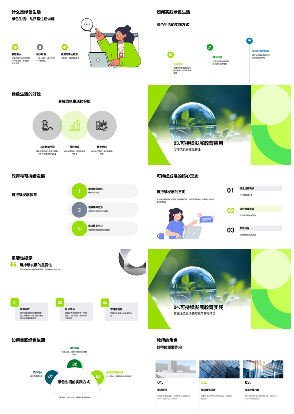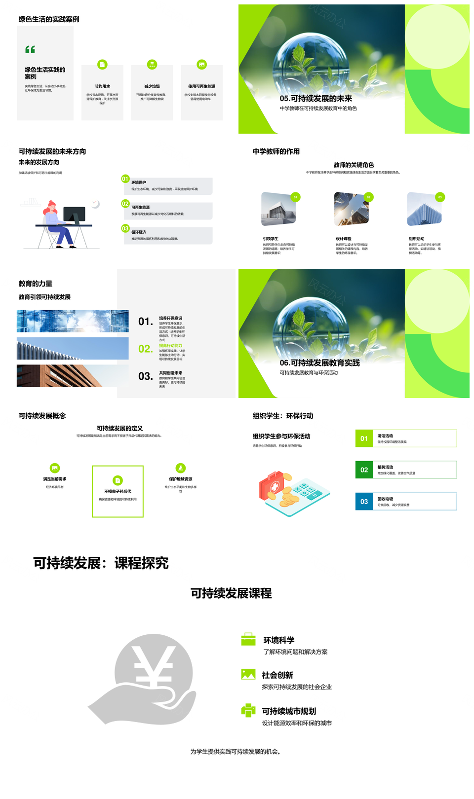风云办公提供的绿色教育引领可持续发展生活PPT模板,下载格式为pptx,一共27页,作品中文字及图均可以修改和编辑,图片更改请在作品中右键图片并更换,文字修改请直接点击文字进行修改。