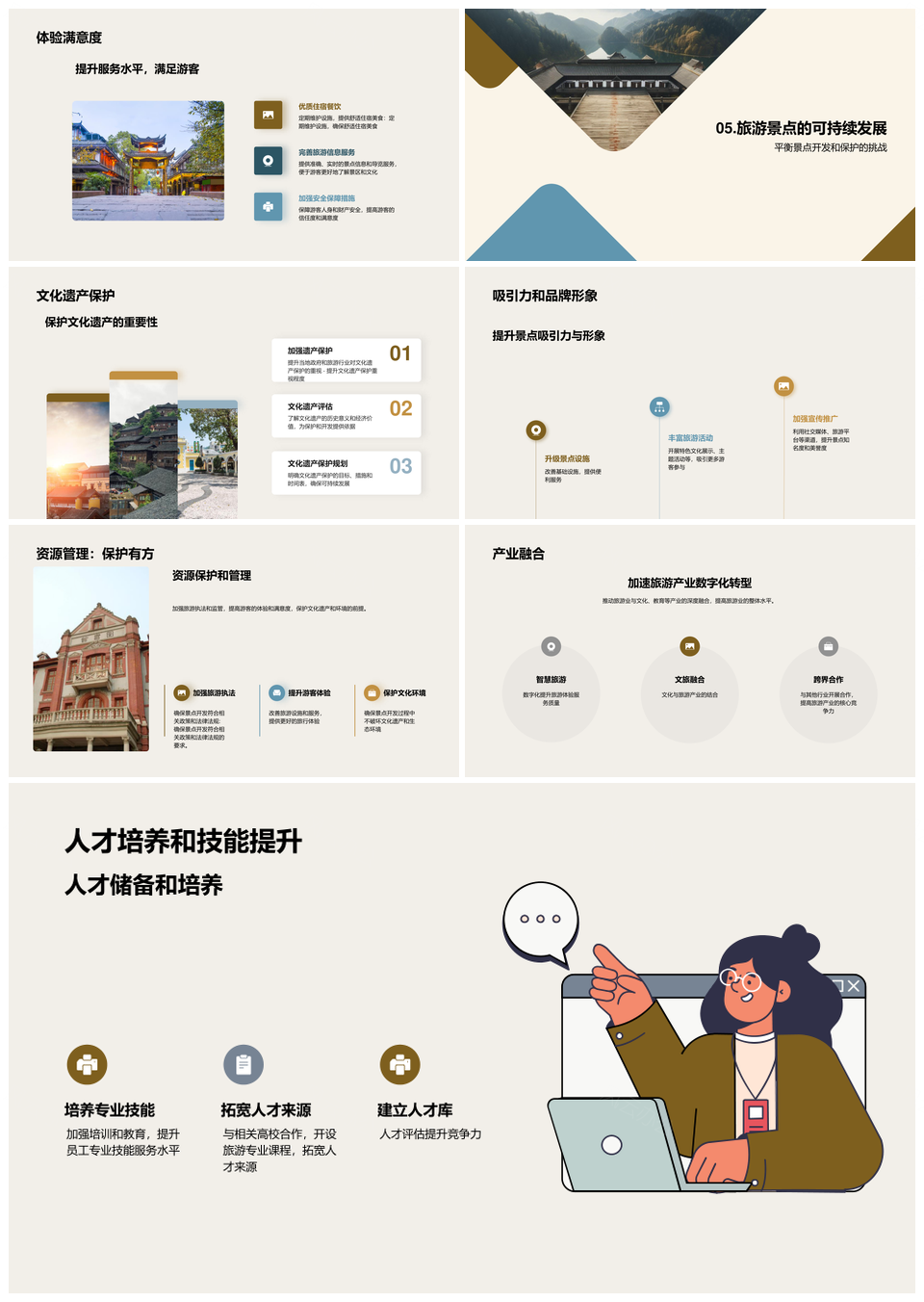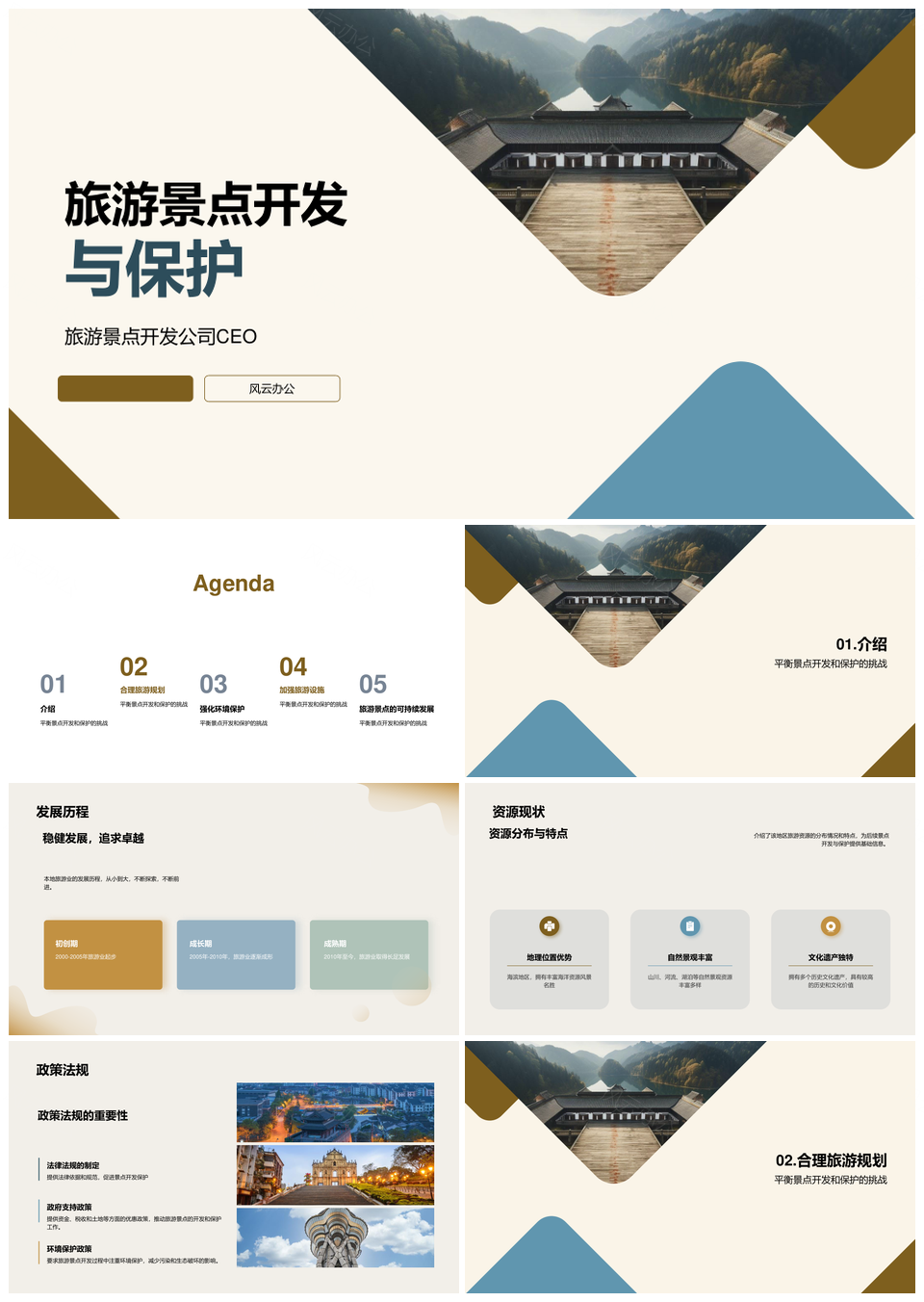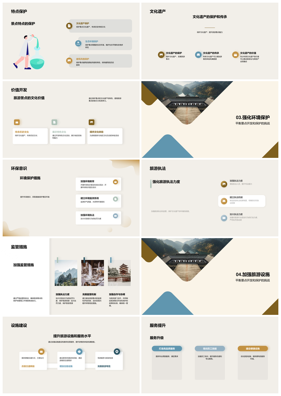 这是一张旅游资源开发保护平衡政策法规文化遗产环境保护PPT模板,包含旅游资源、开发、保护、平衡、政策法规、文化遗产、环境保护等主题内容,也可用作旅游资源开发保护平衡、开发保护平衡政策法规、旅游资源开发保护、开发保护平衡、保护平衡政策法规、平衡政策法规文化遗产、政策法规文化遗产环境保护、文化遗产环境保护平衡、环境保护旅游资源开发、旅游资源政策法规文化、政策法规环境保护平衡、开发保护政策法规文化、文化遗产环境保护开发、平衡环境保护旅游资源、旅游资源开发政策法规等PPT场景使用。 风云办公提供的旅游资源开发保护平衡政策法规文化遗产环境保护PPT模板,下载格式为pptx,一共25页,作品中文字及图均可以修改和编辑,图片更改请在作品中右键图片并更换,文字修改请直接点击文字进行修改。