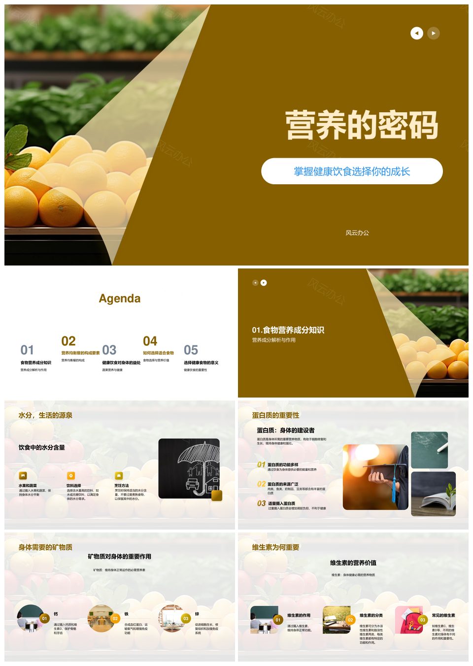 这是一张健康饮食营养密码均衡蛋白质维生素矿物质PPT模板,包含健康饮食、营养、密码、均衡、蛋白质、维生素、矿物质等主题内容,也可用作健康饮食营养密码均衡、健康饮食营养均衡蛋白质、饮食营养均衡蛋白质维生素、营养均衡蛋白质维生素矿物质、健康饮食营养密码、饮食营养密码均衡、营养密码均衡蛋白质、密码均衡蛋白质维生素、健康饮食营养、健康饮食均衡、饮食营养均衡、营养均衡蛋白质、均衡蛋白质维生素、蛋白质维生素矿物质、健康均衡蛋白质等PPT场景使用。 风云办公提供的健康饮食营养密码均衡蛋白质维生素矿物质PPT模板,下载格式为pptx,一共33页,作品中文字及图均可以修改和编辑,图片更改请在作品中右键图片并更换,文字修改请直接点击文字进行修改。