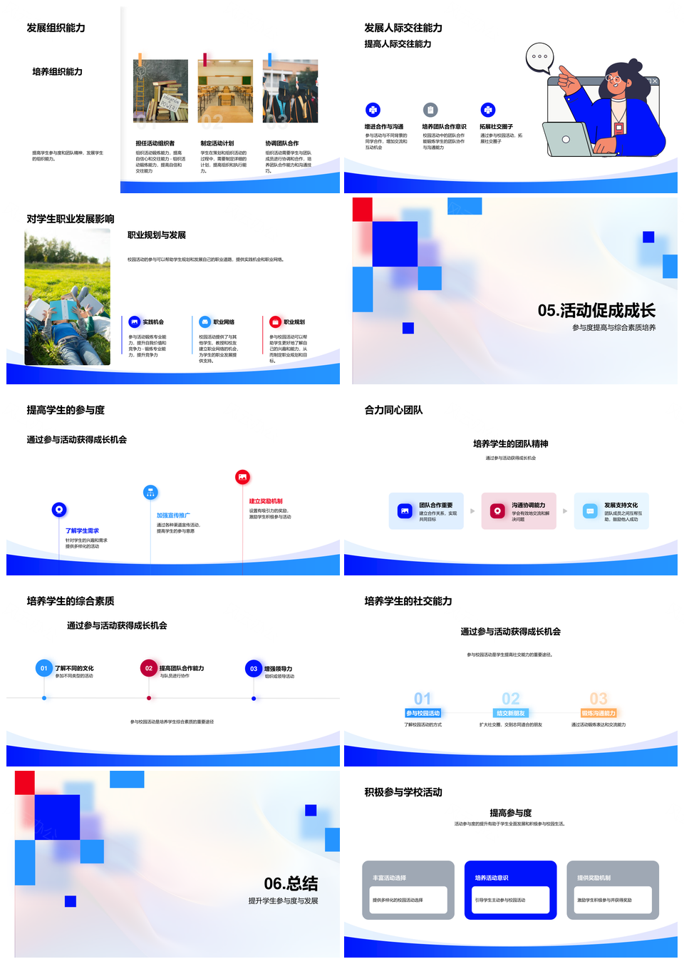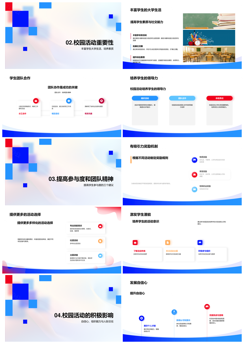 风云办公提供的激励校园活动多样化培养团队领导素质PPT模板,下载格式为pptx,一共32页,作品中文字及图均可以修改和编辑,图片更改请在作品中右键图片并更换,文字修改请直接点击文字进行修改。