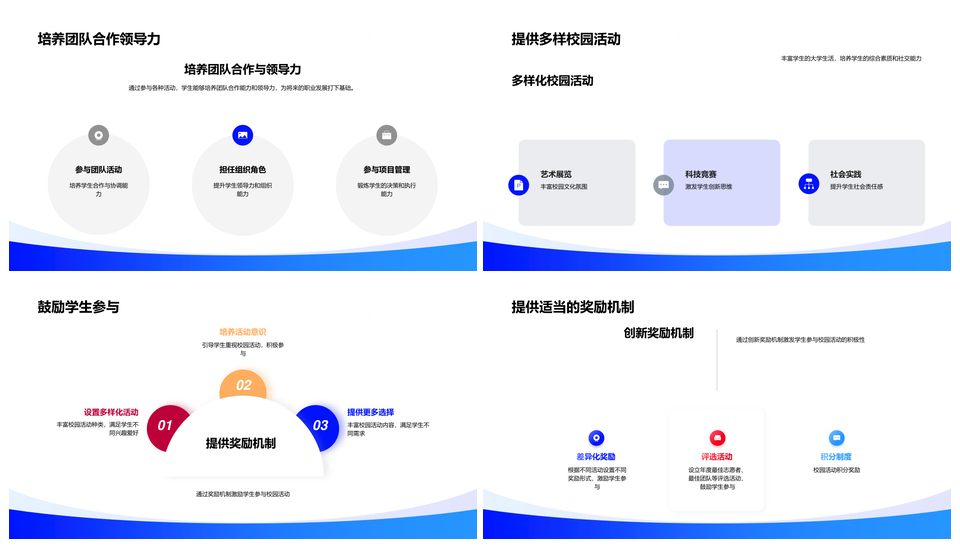 这是一张激励校园活动多样化培养团队领导素质PPT模板,包含激励、校园活动、多样化、培养、团队、领导素质等主题内容,也可用作激励校园活动多样化、校园活动多样化培养、活动多样化培养团队、多样化培养团队领导、培养团队领导素质、激励校园活动、校园活动多样化、活动多样化培养、多样化培养团队、培养团队领导、团队领导素质、激励校园、校园活动、活动多样化、多样化培养等PPT场景使用。