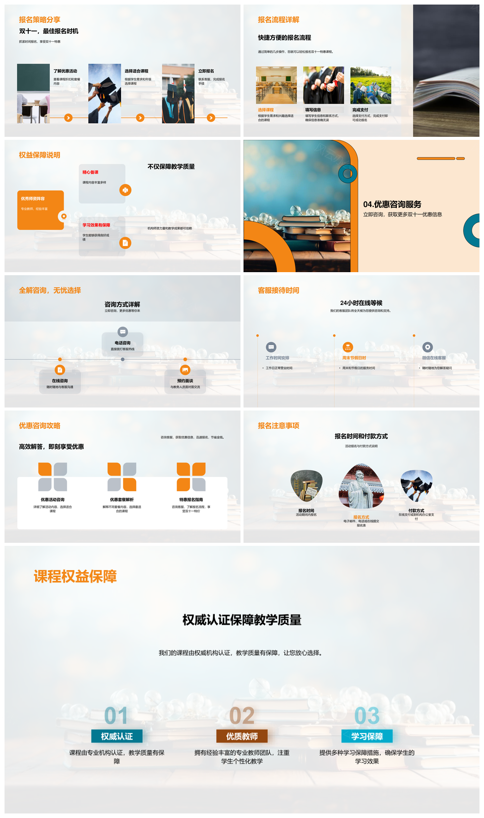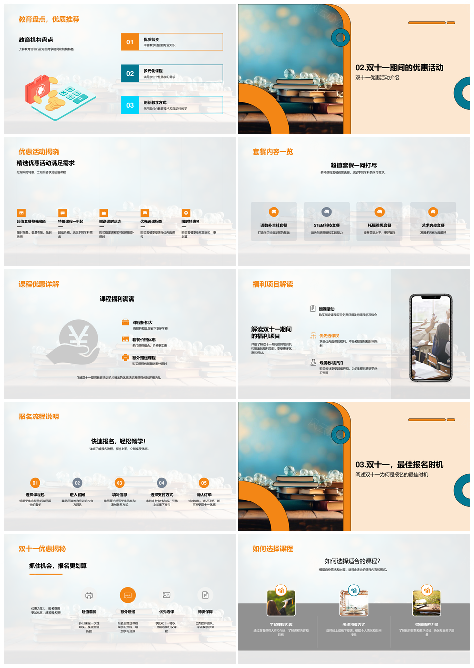 这是一张教培双十一优惠战套餐师资书籍福利PPT模板,包含教培、双十一、优惠战、套餐、师资、书籍、福利等主题内容,也可用作教培双十一优惠套餐、双十一优惠套餐福利、教培双十一师资书籍、优惠套餐师资书籍、套餐师资书籍福利、教培双十一书籍福利、教培双十一优惠、双十一优惠套餐、优惠套餐福利、师资书籍福利、教培师资书籍、双十一书籍福利、教培双十一、双十一优惠、优惠套餐等PPT场景使用。