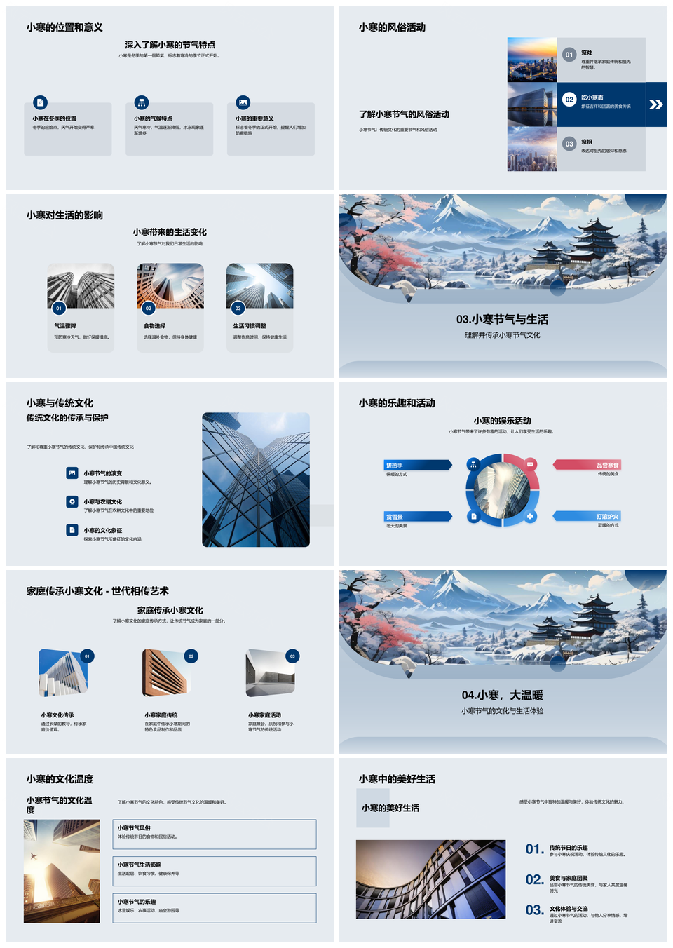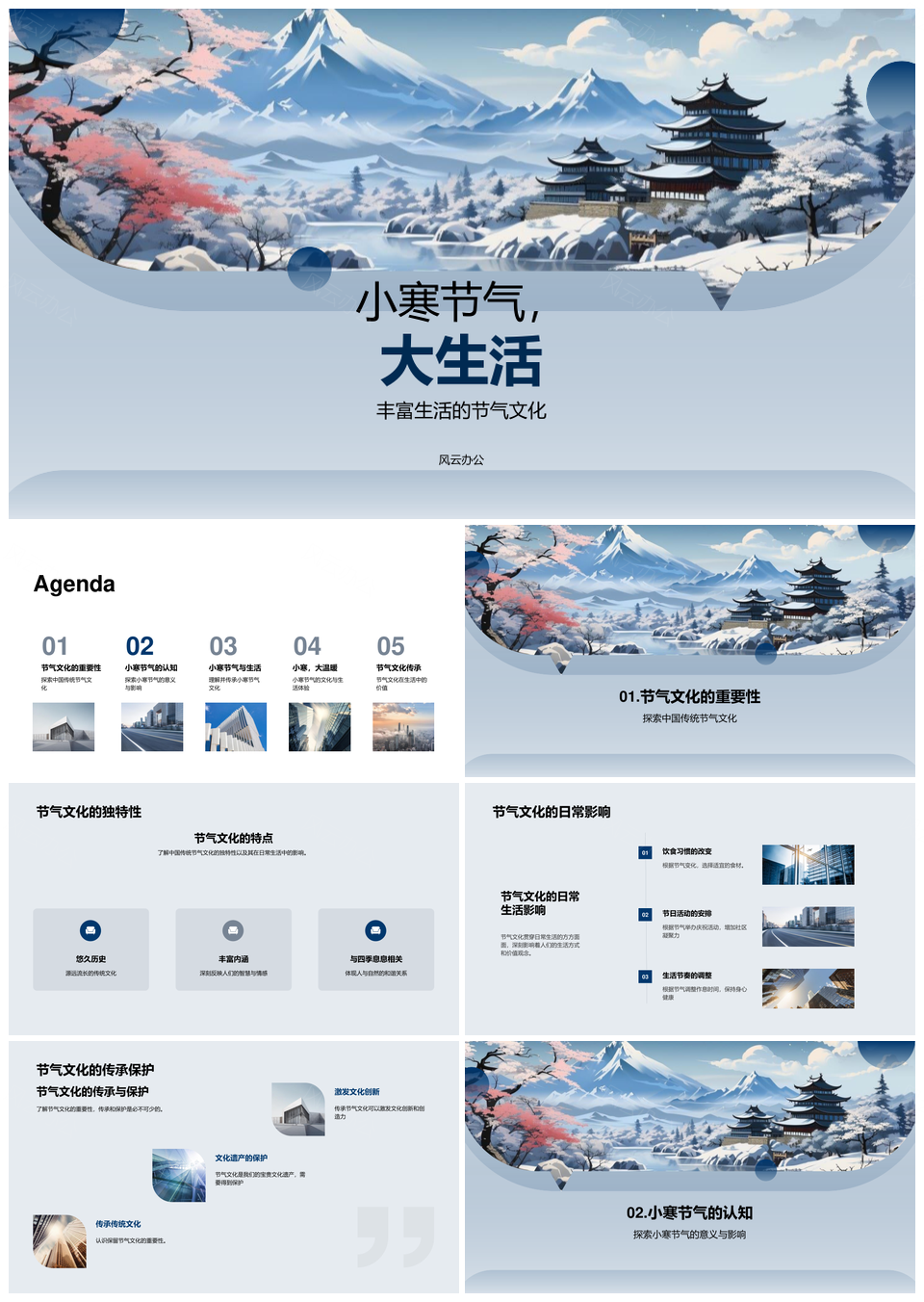 风云办公提供的小寒家庭传承节气文化提升生活PPT模板,下载格式为pptx,一共23页,作品中文字及图均可以修改和编辑,图片更改请在作品中右键图片并更换,文字修改请直接点击文字进行修改。