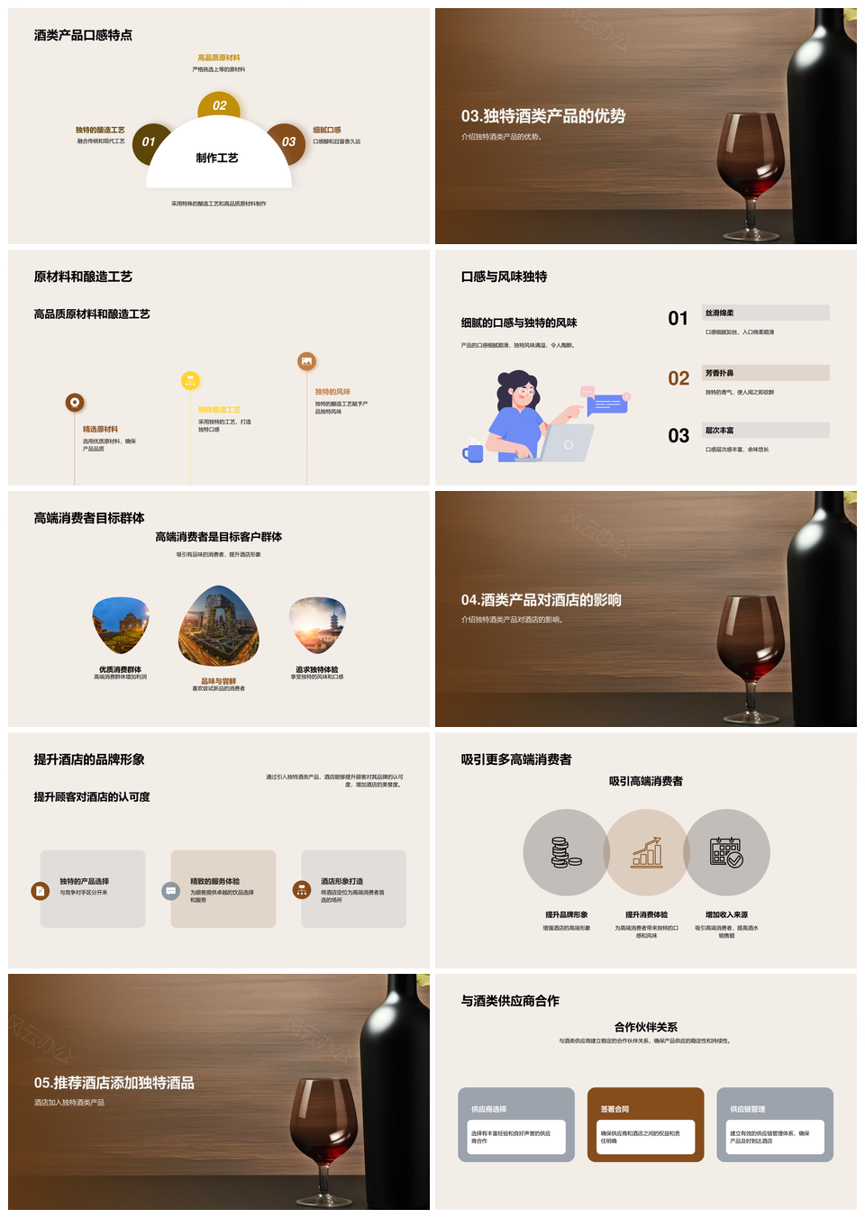这是一张酒品新势力精工葡酿酒店经理推介锁定高端客群PPT模板,包含酒品、新势力、精工、葡酿、酒店、经理、推介、锁定、高端、客群等主题内容,也可用作酒品新势力精工葡酿、新势力精工葡酿酒店、精工葡酿酒店经理、葡酿酒店经理推介、酒店经理推介锁定、经理推介锁定高端、推介锁定高端客群、酒品新势力精工、新势力精工葡酿、精工葡酿酒店、葡酿酒店经理、酒店经理推介、经理推介锁定、推介锁定高端、锁定高端客群等PPT场景使用。 风云办公提供的酒品新势力精工葡酿酒店经理推介锁定高端客群PPT模板,下载格式为pptx,一共20页,作品中文字及图均可以修改和编辑,图片更改请在作品中右键图片并更换,文字修改请直接点击文字进行修改。