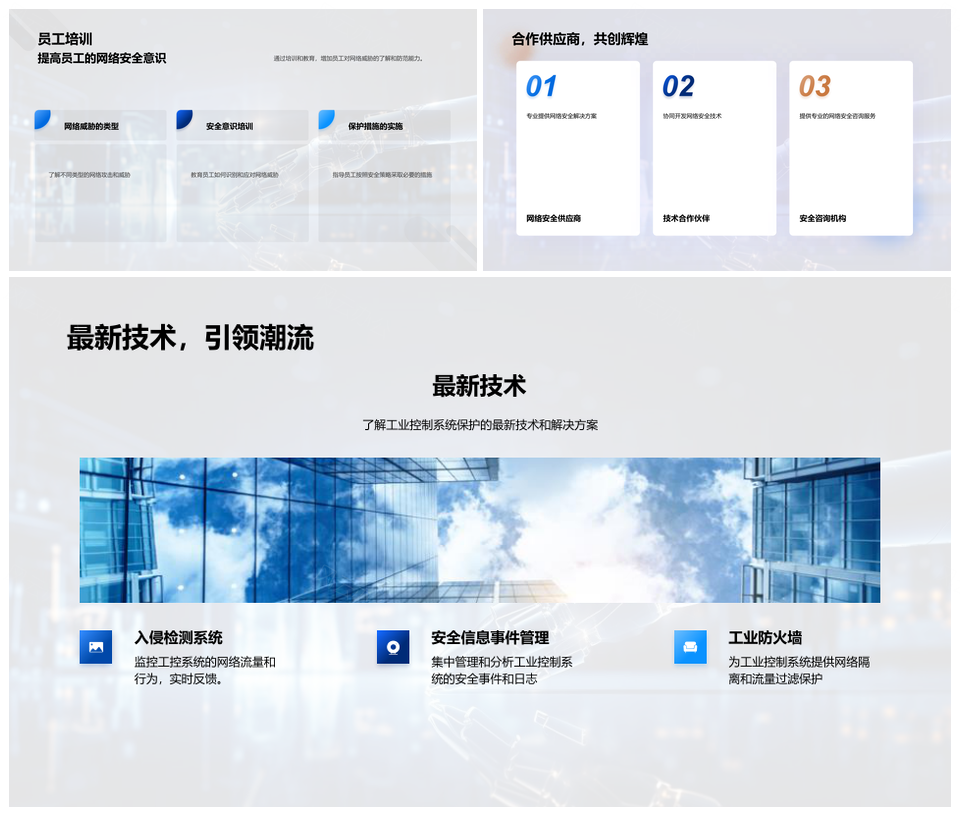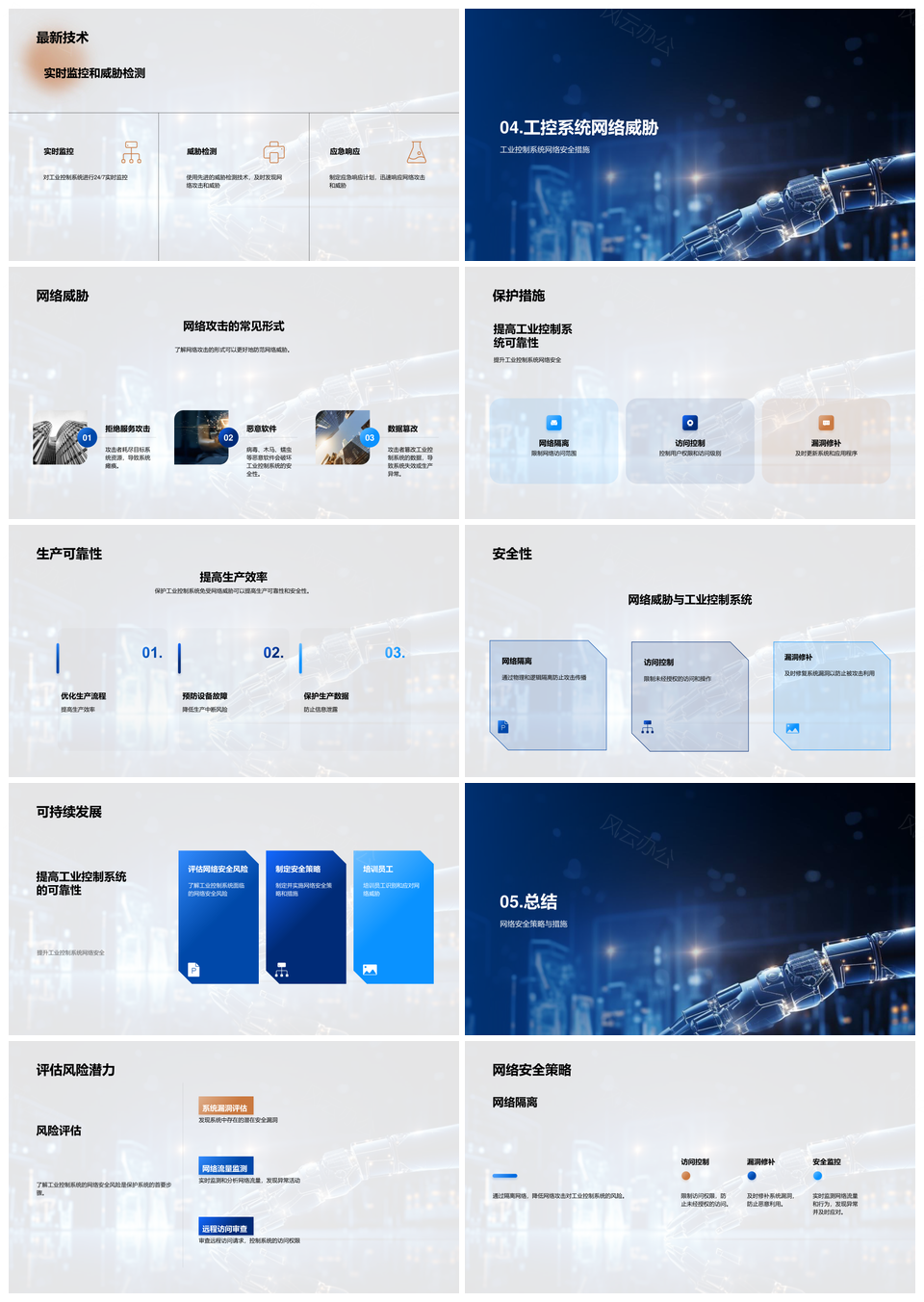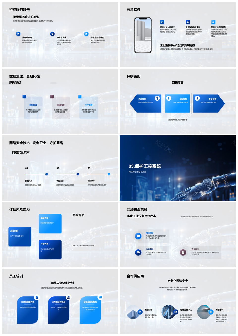 这是一张工控系统网络安全防御攻击消漏洞避中断PPT模板,包含工控系统、网络安全、防御、攻击、消漏洞、避中断等主题内容,也可用作工控系统网络安全防御攻击、工控系统网络安全防御漏洞、工控系统网络安全防御中断、工控系统防御攻击漏洞中断、网络安全防御攻击漏洞中断、工控系统网络安全漏洞中断、防御攻击漏洞避中断、工控系统防御攻击漏洞、网络安全防御攻击漏洞、防御攻击漏洞中断、工控系统防御漏洞中断、网络安全防御漏洞中断、工控系统网络安全防御、防御攻击漏洞、漏洞避中断等PPT场景使用。 风云办公提供的工控系统网络安全防御攻击消漏洞避中断PPT模板,下载格式为pptx,一共31页,作品中文字及图均可以修改和编辑,图片更改请在作品中右键图片并更换,文字修改请直接点击文字进行修改。