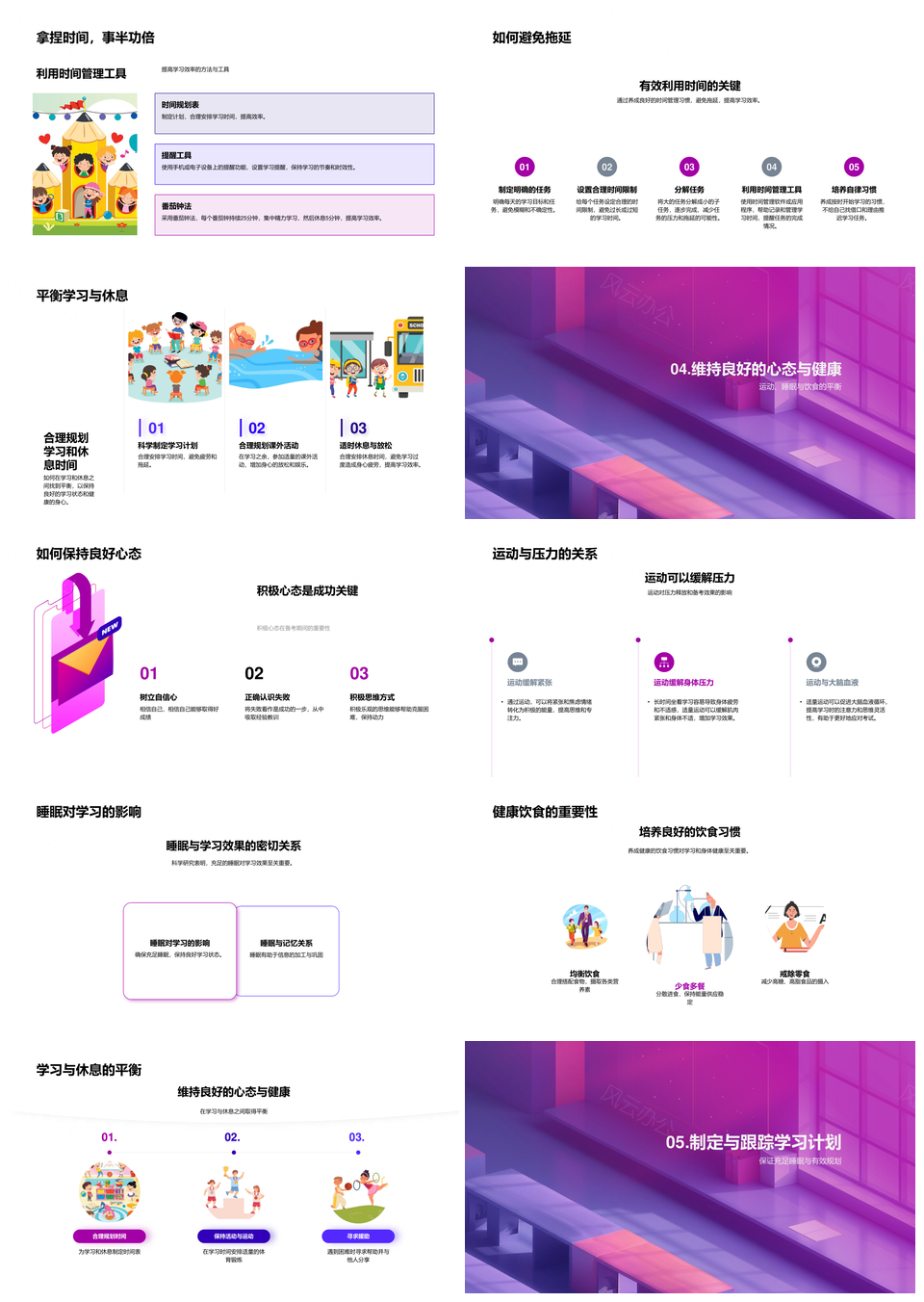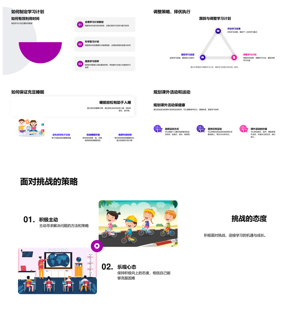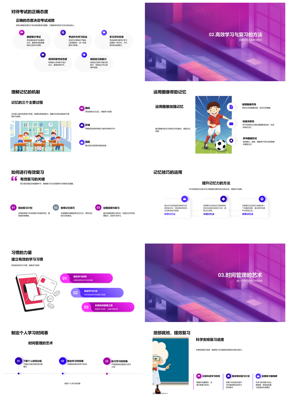 这是一张考试备考指南学习规划压力管理时间记忆科学复习PPT模板,包含考试、备考指南、学习规划、压力管理、时间、记忆、科学复习等主题内容,也可用作考试备考指南学习、备考指南学习规划、指南学习规划压力、学习规划压力管理、规划压力管理时间、压力管理时间记忆、管理时间记忆科学、时间记忆科学复习、考试备考指南、备考指南学习、指南学习规划、学习规划压力、规划压力管理、压力管理时间、管理时间记忆等PPT场景使用。 风云办公提供的考试备考指南学习规划压力管理时间记忆科学复习PPT模板,下载格式为pptx,一共33页,作品中文字及图均可以修改和编辑,图片更改请在作品中右键图片并更换,文字修改请直接点击文字进行修改。