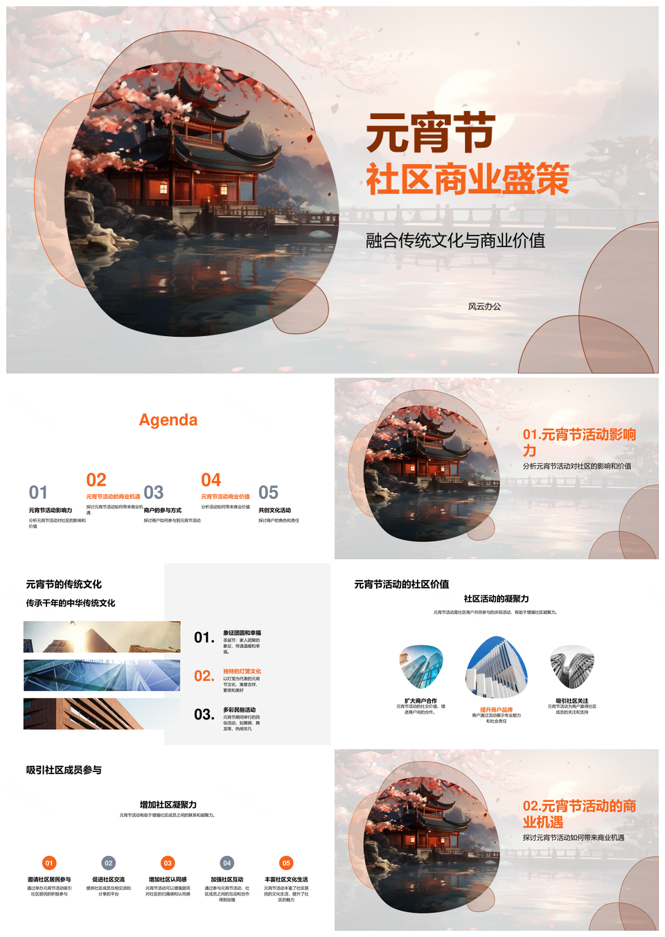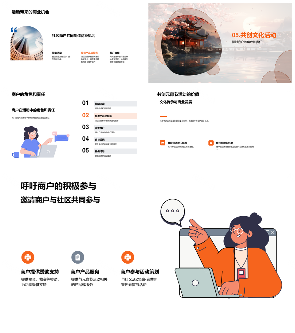 这是一张元宵社区商机灯笼凝聚商户传统文化活动PPT模板,包含元宵、社区、商机、灯笼、凝聚、商户、传统、文化、活动等主题内容,也可用作元宵社区商机灯笼凝聚商户传统文化活动、元宵社区商户传统文化活动、社区商机灯笼凝聚商户、灯笼凝聚商户传统文化活动、商户传统文化活动商机灯笼、元宵灯笼传统文化活动、元宵社区传统文化活动、社区商户传统文化活动、灯笼凝聚商户活动、传统文化活动商机灯笼、社区凝聚商户活动、商户商机灯笼活动、元宵灯笼商户活动、传统文化活动灯笼、商户商机灯笼等PPT场景使用。 风云办公提供的元宵社区商机灯笼凝聚商户传统文化活动PPT模板,下载格式为pptx,一共23页,作品中文字及图均可以修改和编辑,图片更改请在作品中右键图片并更换,文字修改请直接点击文字进行修改。