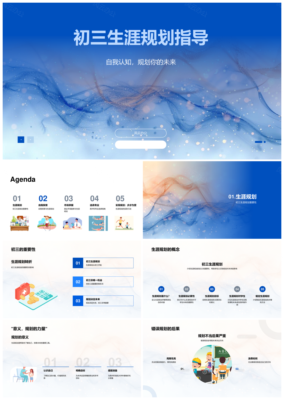 风云办公提供的初三生涯规划自我认知升学专业趋势PPT模板,下载格式为pptx,一共28页,作品中文字及图均可以修改和编辑,图片更改请在作品中右键图片并更换,文字修改请直接点击文字进行修改。