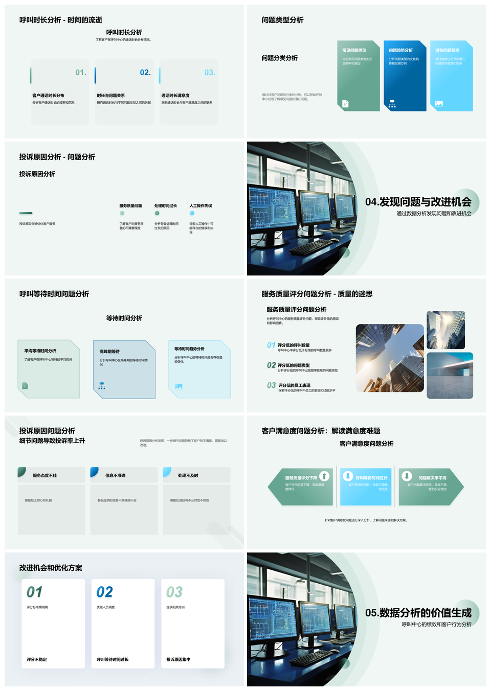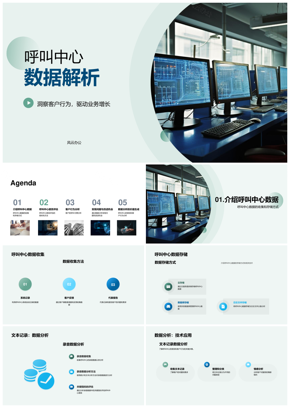 这是一张呼叫中心数据收集存储分析洞察关键指标绩效评估客户行为PPT模板,包含呼叫中心、数据收集、存储、分析、洞察、关键指标、绩效评估、客户行为等主题内容,也可用作呼叫中心数据收集存储分析、数据收集存储分析洞察、存储分析洞察关键指标、分析洞察关键指标绩效评估、洞察关键指标绩效评估客户行为、呼叫中心数据收集存储、数据收集存储分析、存储分析洞察关键指标、分析洞察关键指标绩效评估、关键指标绩效评估客户行为、数据收集存储分析、存储分析洞察关键指标、分析洞察关键指标、绩效评估客户行为、关键指标绩效评估等PPT场景使用。 风云办公提供的呼叫中心数据收集存储分析洞察关键指标绩效评估客户行为PPT模板,下载格式为pptx,一共33页,作品中文字及图均可以修改和编辑,图片更改请在作品中右键图片并更换,文字修改请直接点击文字进行修改。