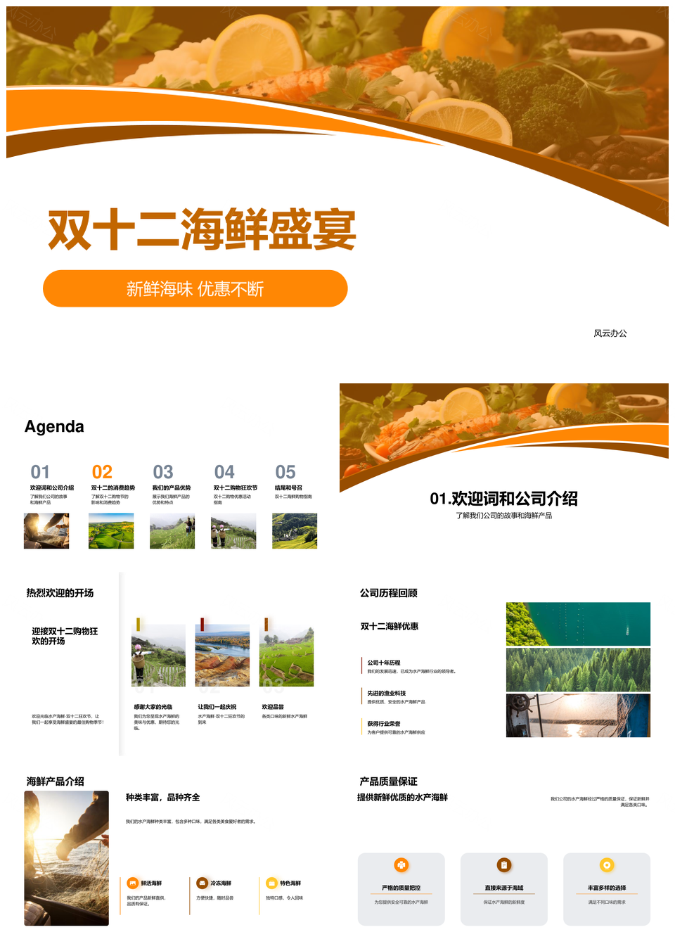 风云办公提供的双十二海鲜盛宴购物节新鲜海味优惠PPT模板,下载格式为pptx,一共28页,作品中文字及图均可以修改和编辑,图片更改请在作品中右键图片并更换,文字修改请直接点击文字进行修改。