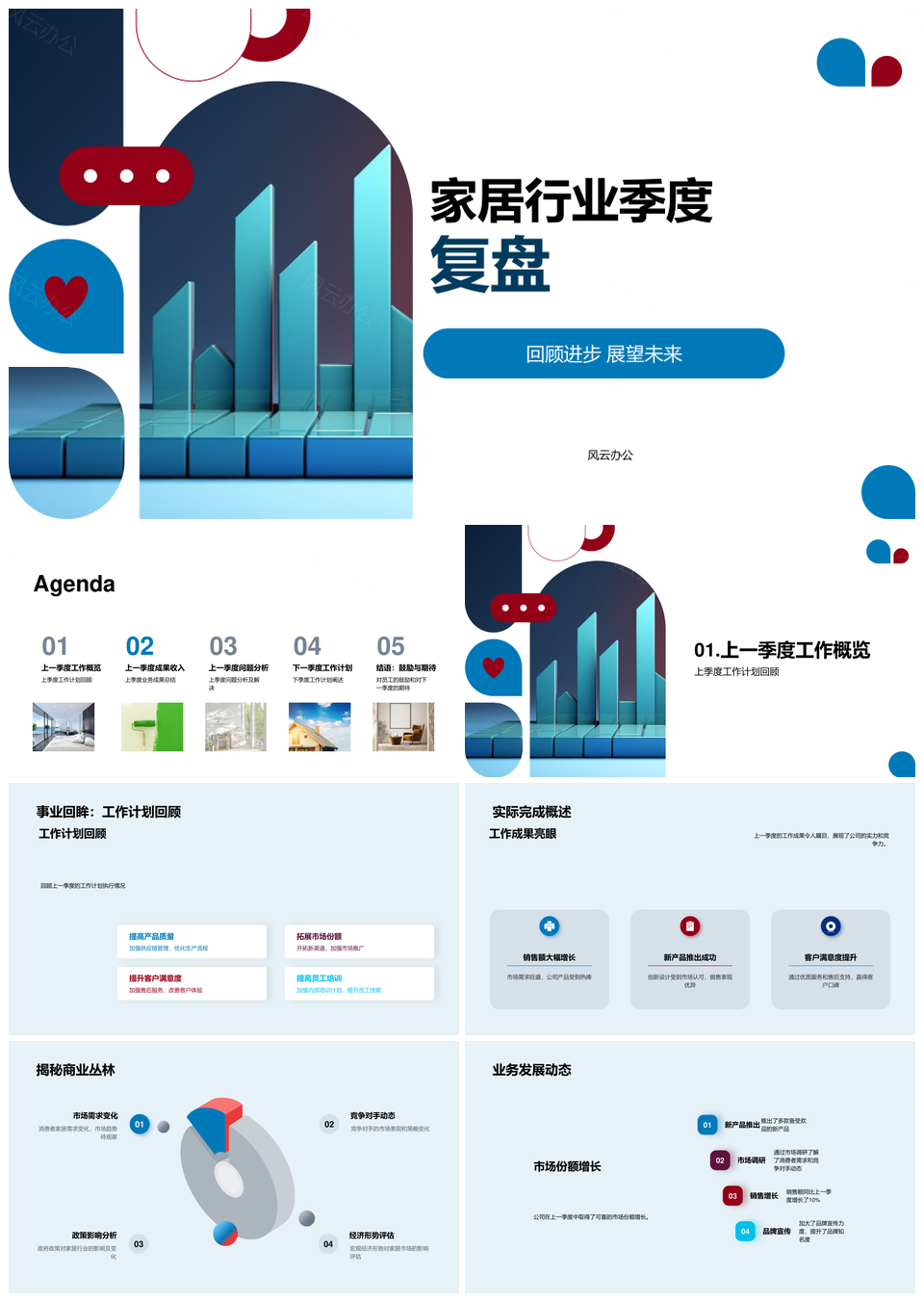 风云办公提供的家居行业季度复盘工作成果与市场分析PPT模板,下载格式为pptx,一共28页,作品中文字及图均可以修改和编辑,图片更改请在作品中右键图片并更换,文字修改请直接点击文字进行修改。